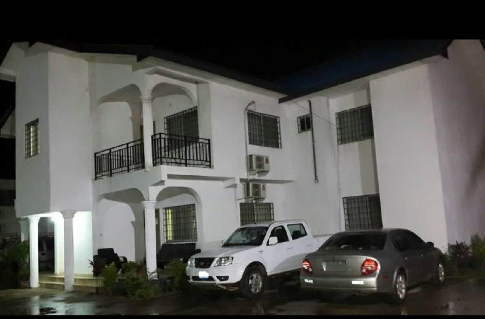 Overall, the compound has nine (9) spacious rooms and two (2) master private rooms with eleven (11) bathrooms. Each fully furnished apartment provides a feeling of a home with a front and back porch, kitchen, family room (in some), dining room, and living room with sofas and a flat screen TV. Compound is completely fenced in, away from main street and traffic, and has 24/7 security.