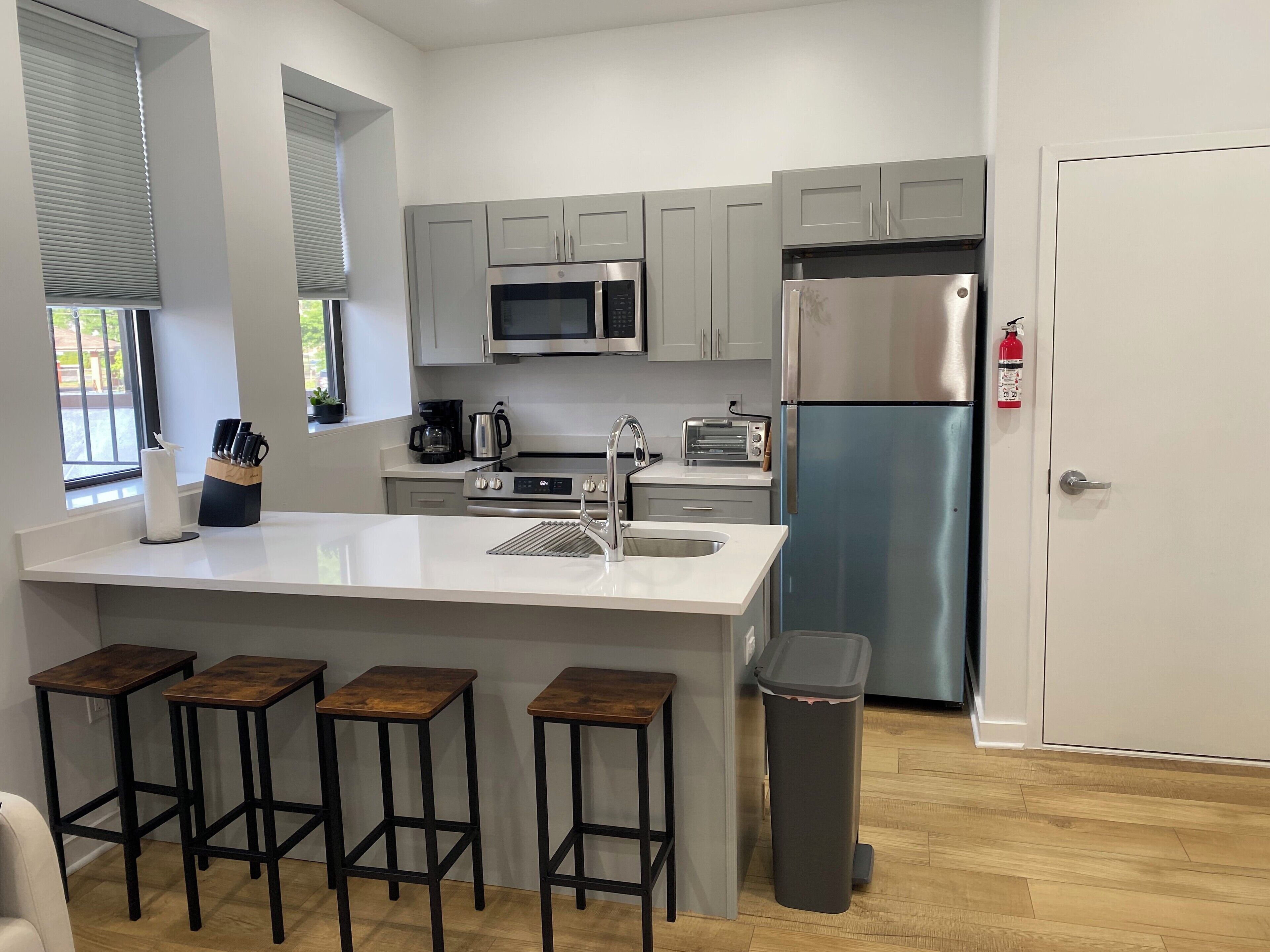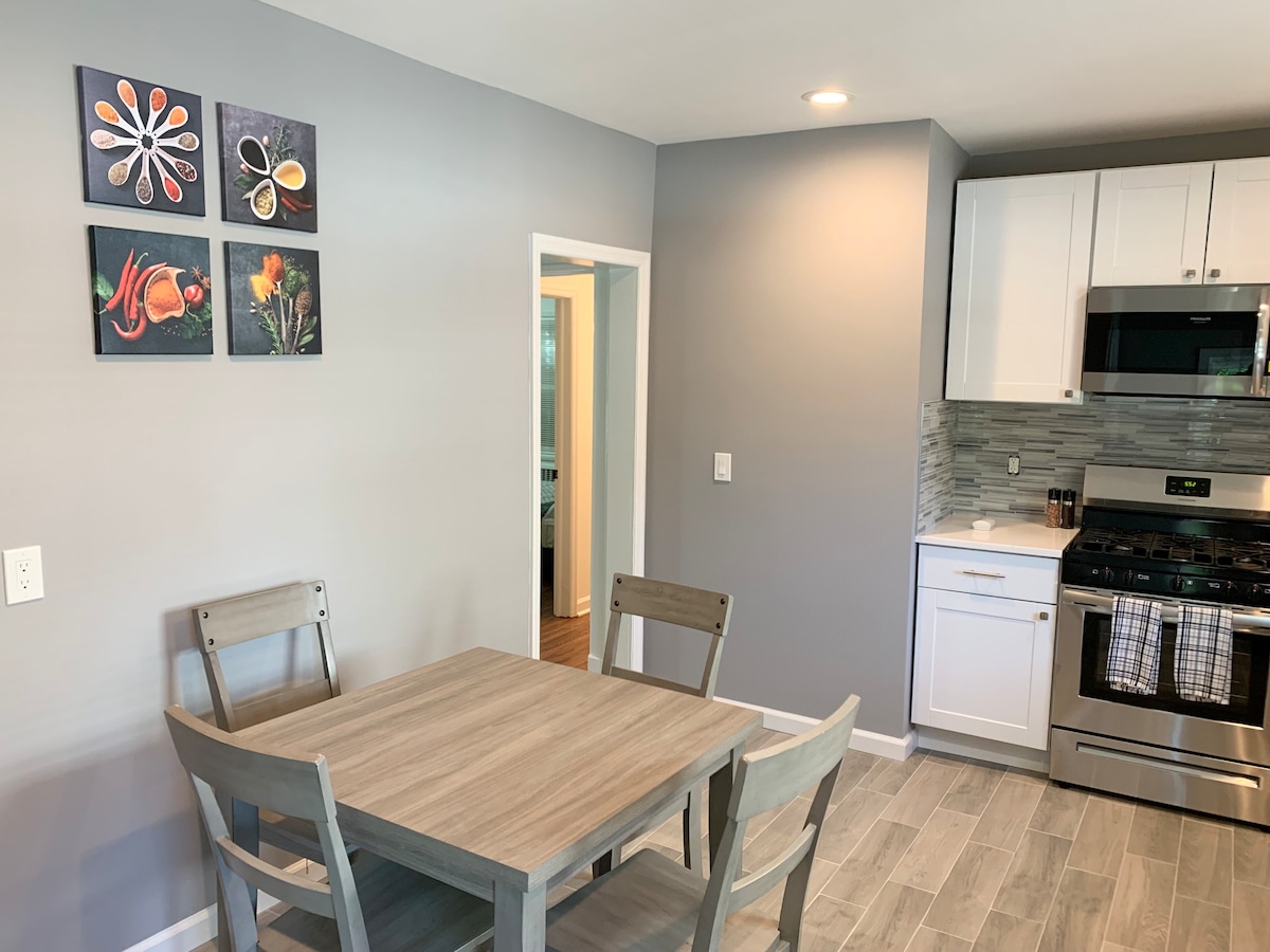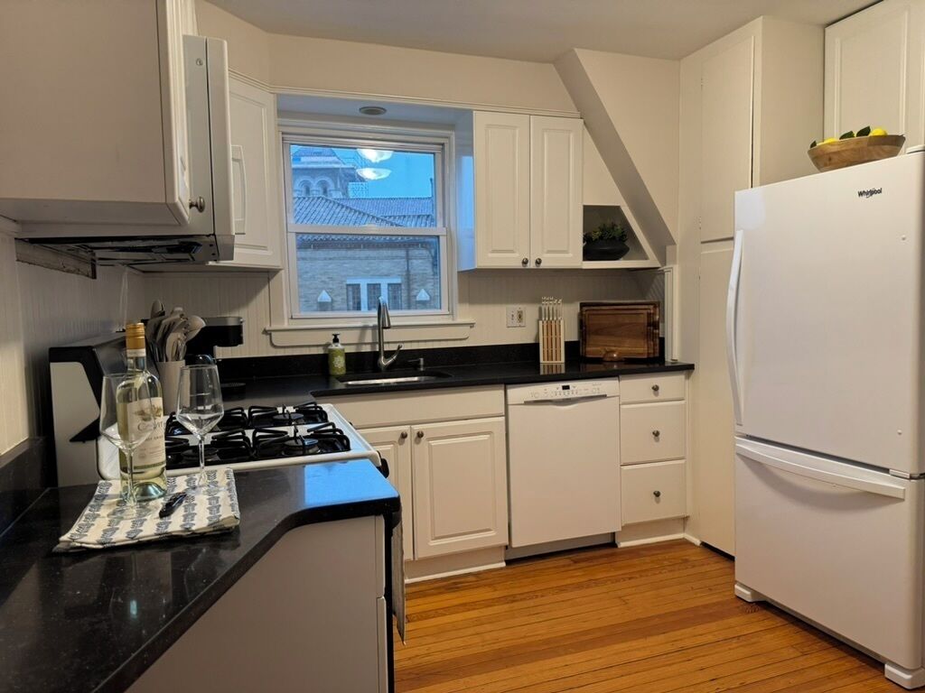 This apartment is Located in an entertainment area with many great restaurants! Situated between two parks as well as two train stations going to NYC. Kitchen has full-size fridge and stove/oven, microwave, toaster , ninja juicer, Keurig machine.