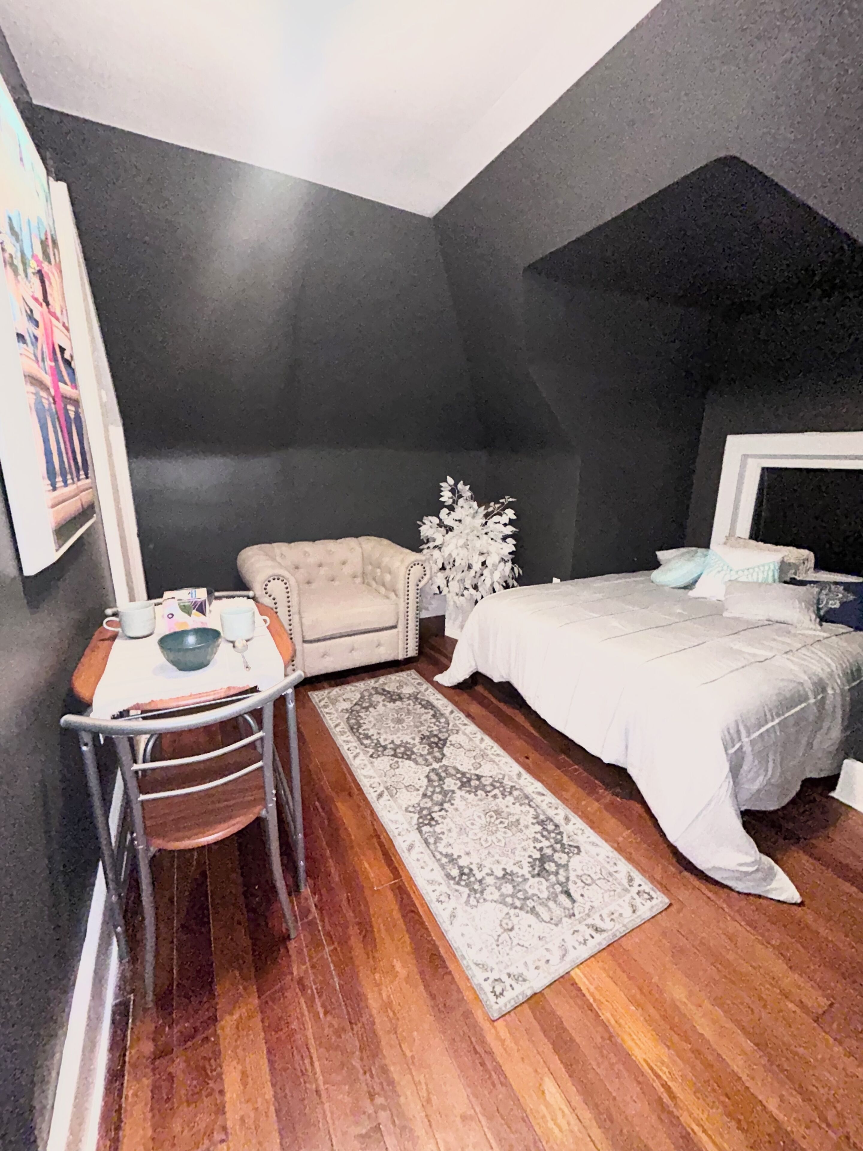 This is a second floor apartment and when renting as one bedroom, you have a a king size bed, living room, dining room, kitchen and bathroom.