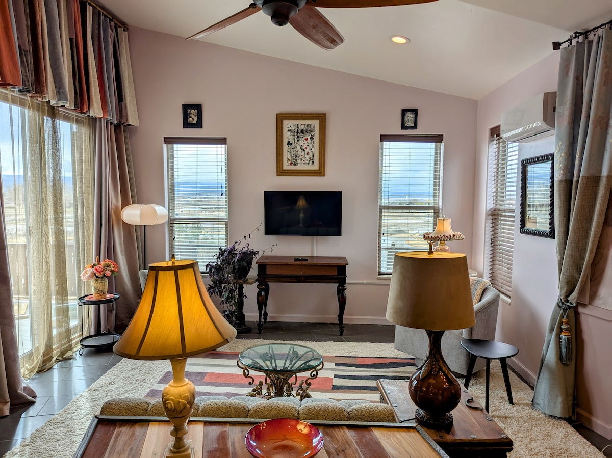 This cozy nest is a second story 1 bedroom apartment with a king bed and twin daybed with trundle. There is a patio set on the private balcony with beautiful views of the Grand Mesa! Rustic wood touches throughout, a convenient small kitchen and living area with TVs in both rooms. The kitchen is supplied with coffee maker, mugs, dishes, pans, mini fridge and microwave.