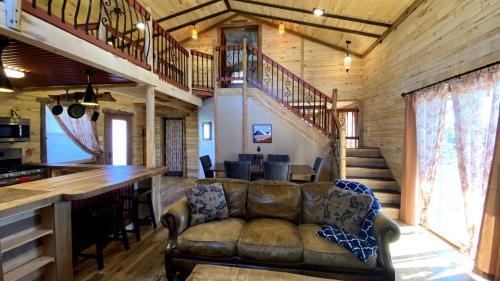 This custom apartment at The Cedaredge Lodge is our crown jewel! It features stunning woodwork throughout, 2 private balconies, a wood stove, a beautiful kitchen and dining area and an upscale bathroom. The upstairs has a king bedroom and a unique catwalk to a loft with two covertable queen chairs. The bedroom on the main floor has two twin beds and plenty of storage space. There is a sofa in the living area.