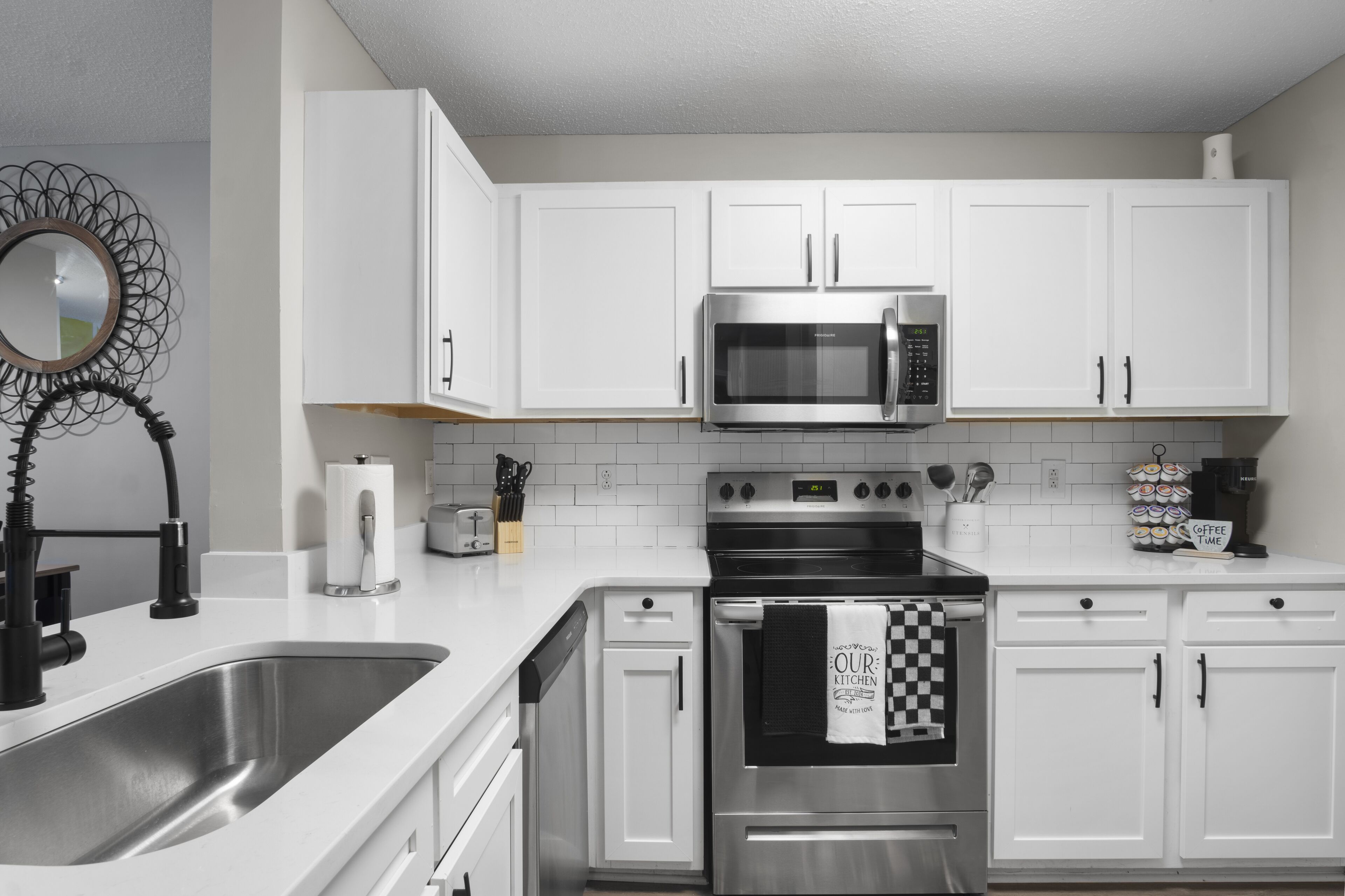Kitchen has a full size refrigerator, range, dishwasher and microwave.
