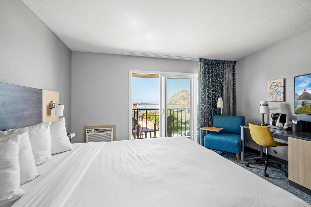 Deluxe King room with a private balcony with a partial view of Morro Rock with modern furnishing. The room comes with complimentary Wifi, refrigerator, A/C, Keurig coffee maker, iron, and 50" TV. The property is located in downtown Morro Bay and within walking distance to all of the local shops and restaurants.