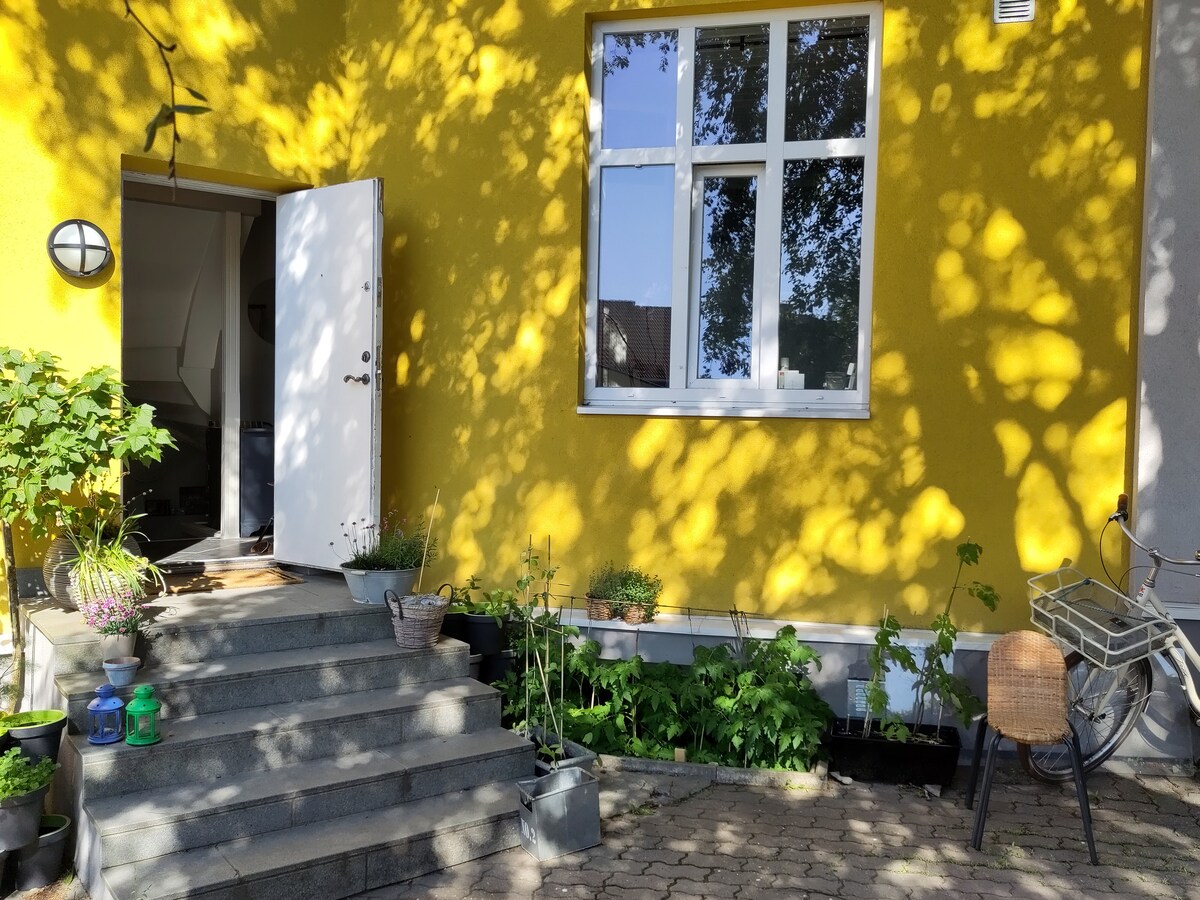You live in a house from 1900. It has been an old school that has been converted into a detached house. The apartment is located on the 2. floor ( one stairs up from ground) and has its own entrance.