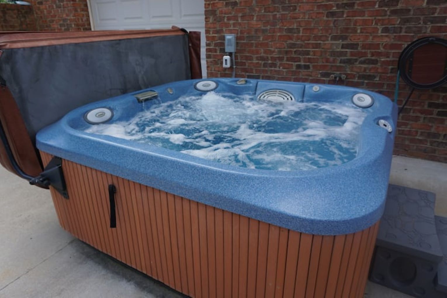 To get to the hot tub, walk up the front yard steps. Take the sidewalk to the left side of the house.