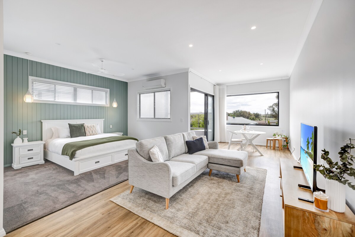 A stylish, spacious and welcoming home-away-from home in the heart of Mudgee. Only footsteps away from the regions best cafes and bars, MySpace Studios are luxurious spaces designed specifically for couples and meticulous professionals in need of a quiet oasis in this fabulous town. Sleeping 2 guests the loft has it's own private entry and is spacious with an oversized king bed and reverse cycle air-conditioning.
