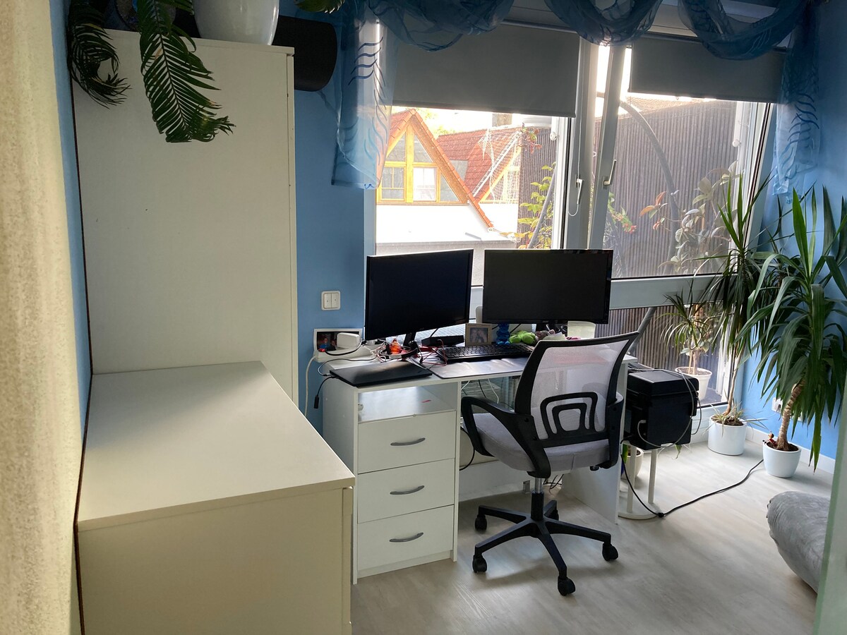 You come from the small hallway directly into the living room with couch and dining table (through room), from there it goes into the kitchen, the shared bathroom and the stairs up to my bedroom. The room is open to the top as it is a gallery apartment, so be quiet in the evening as I sleep on the first floor. We will share the dining table.