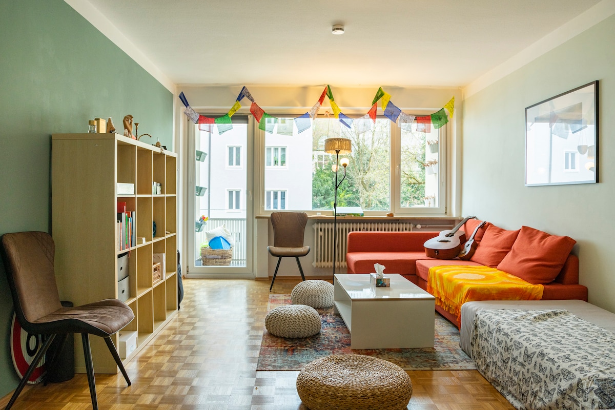 As our guests you can use all of the spaces in our home other than our bedroom. You'll have your own private bedroom, all other spaces are shared with us. Feel free to use our kitchen to cook a meal - we love cooking with our guests! If you come by car, you can park on the street with a parking ticket. Our shared living room and balcony invite you to relax and unwind from your daily adventures in Munich !