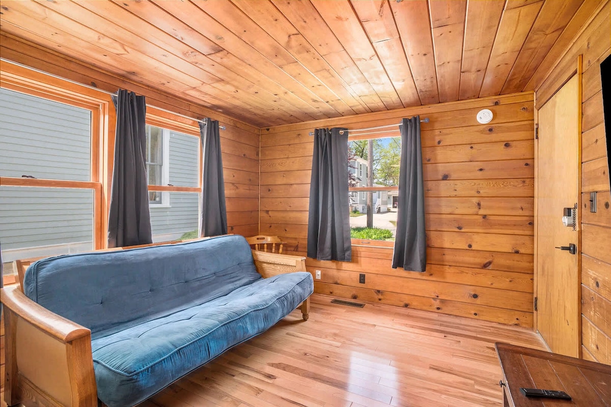 Nestled just two blocks from downtown Grand Haven, Log Haven is a cozy retreat with the soul of a cabin and the charm of an older home. Inside, you’ll find warm, wood-toned interiors that evoke a rustic lodge feel — a quiet throwback to simpler days. From the outside, it's a classic residential house; inside, it's a tucked-away haven featuring futons in both the kitchen and bedroom to offer flexible, functional comfort.