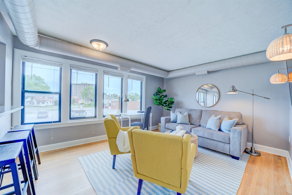 The Leonard Luxury Apartments combine modern city living with waterfront views to give you the ultimate upscale, urban, lifestyle. This completely furnished 2 bedroom luxury apartment features modern design with premium finishes and great city views of Downtown Muskegon. With 2 bedrooms (1 King / 1 Queen), 2 baths and 1169 square feet, this apartment is roomier than most two bedrooms. It includes all the necessity's needed like: bedding, linens, housewares, etc.. It also includes 2 sofa beds for added guests (apartment sleeps 8 total, please inquire regarding additional occupancy fees). It is centrally located and within a short walking distance to restaurants, shopping, entertainment and Muskegon's Famous Farmers Market. Additional features: high efficiency natural gas heat, central air conditioning, gas stove/oven, washer/dryer, dishwasher, k-cup coffee maker and microwave. Free Gigabit Internet is included with Roku Streaming TV's in each bedroom and living room. Onsite parking is available right behind the building.