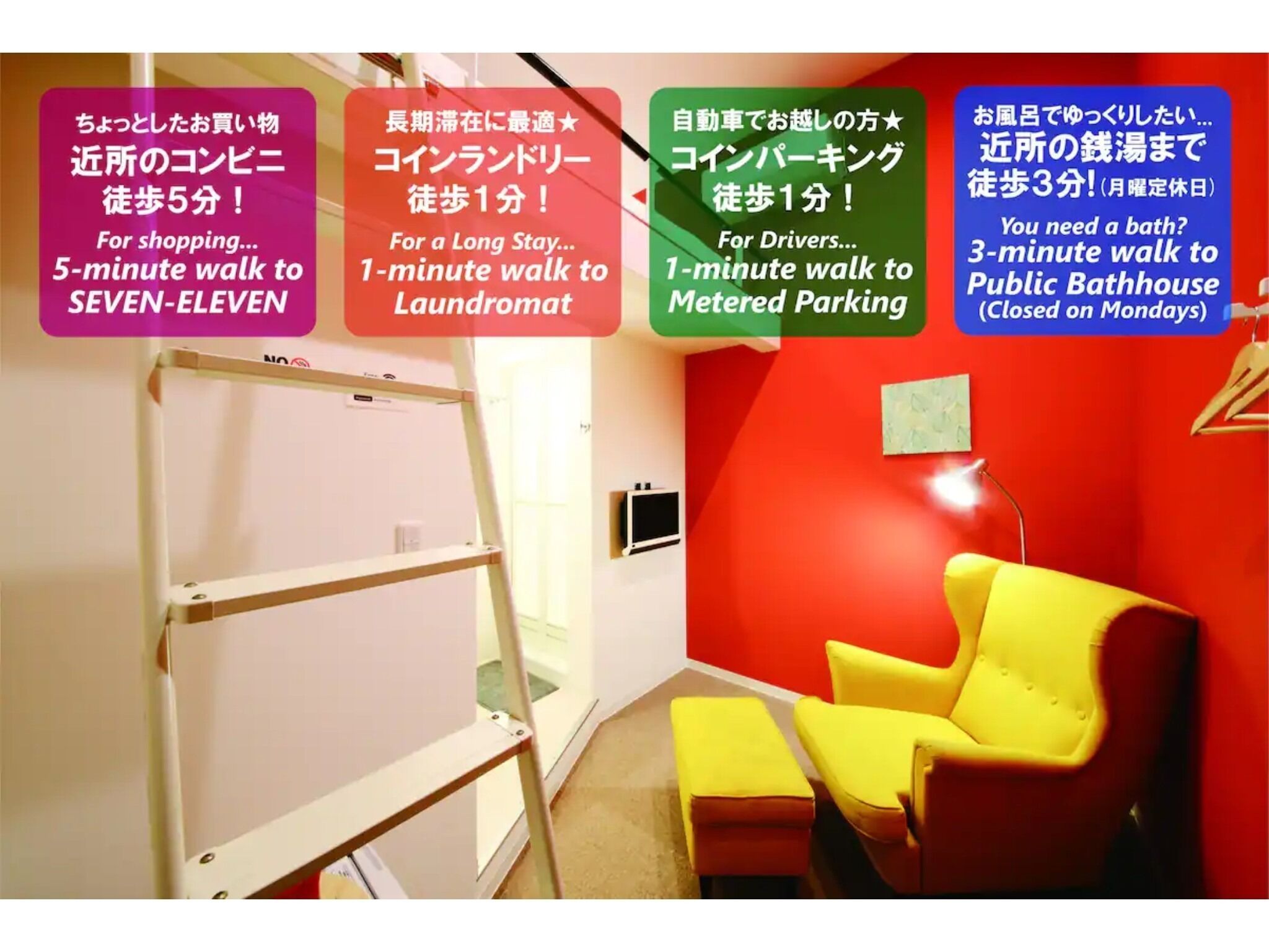 We have a pleasant stay with a large chair.There are also convenience stores within walking distance and bicycles, and some tourist attractions sell fashionable cafes and crops.
