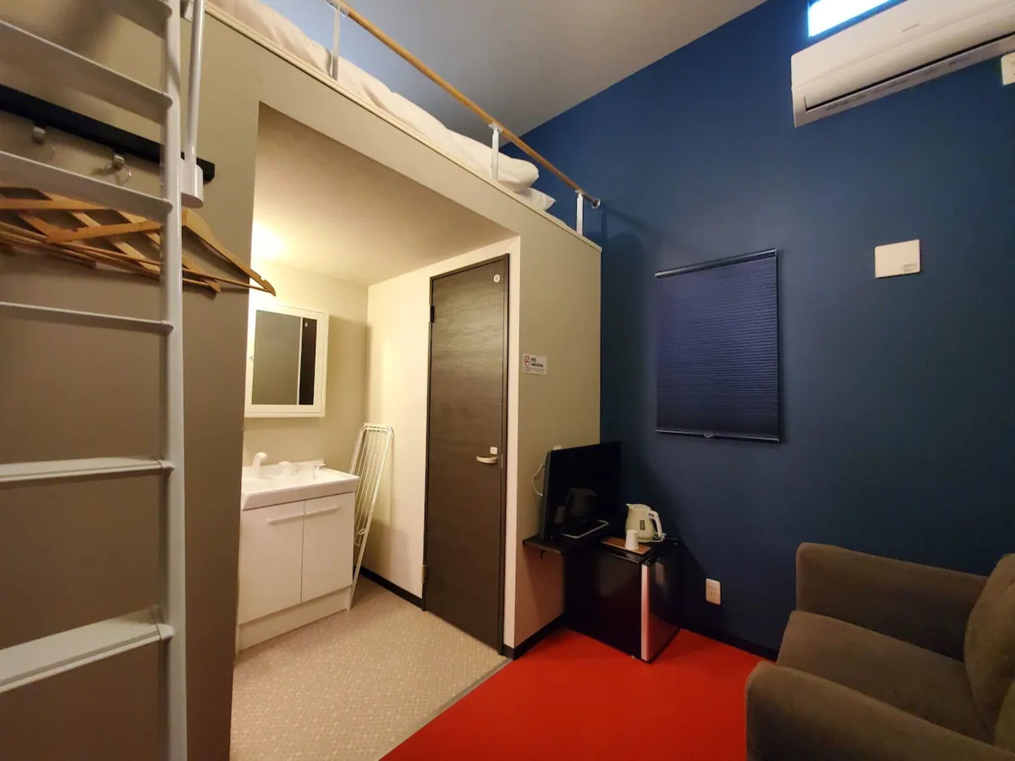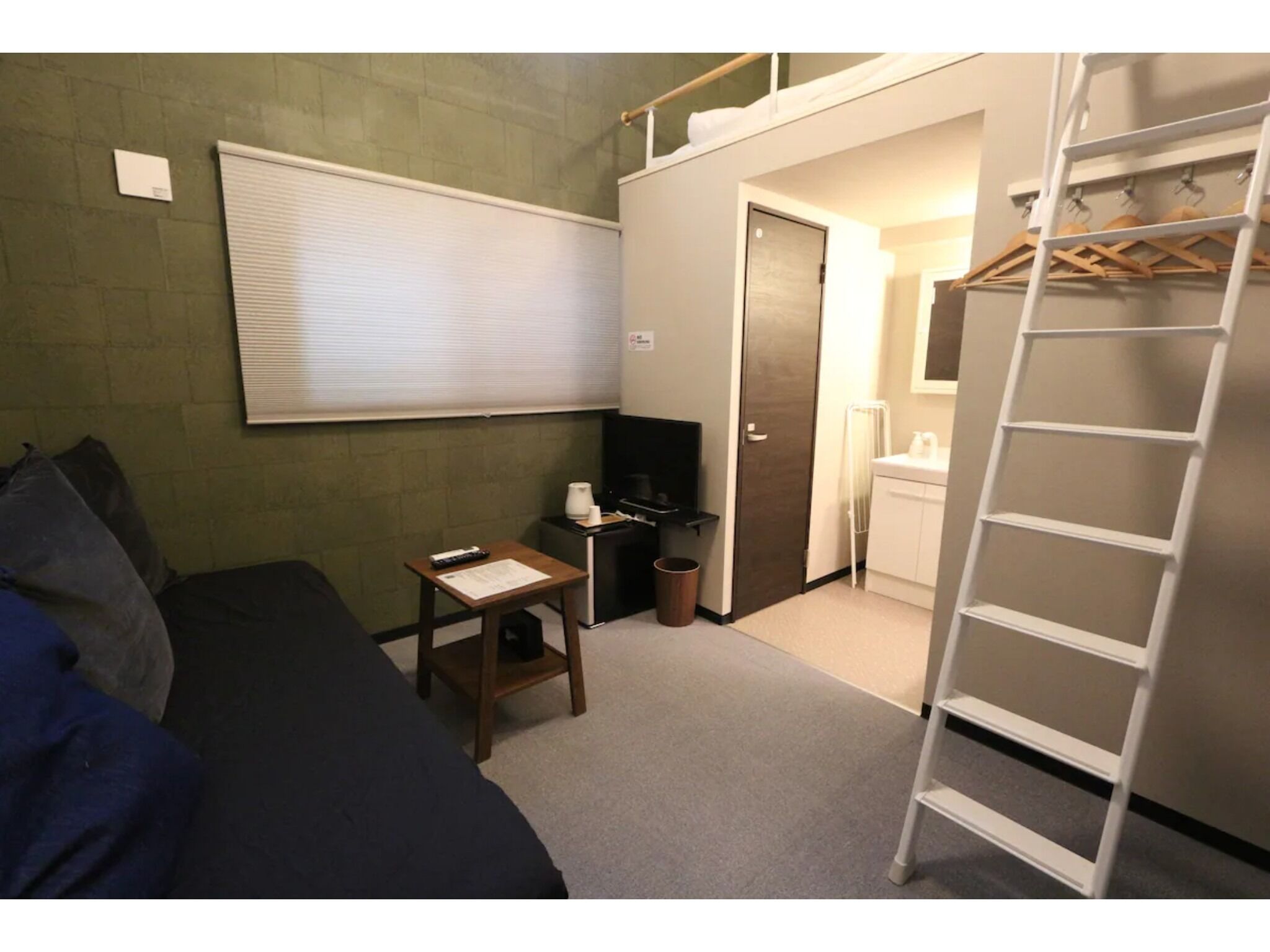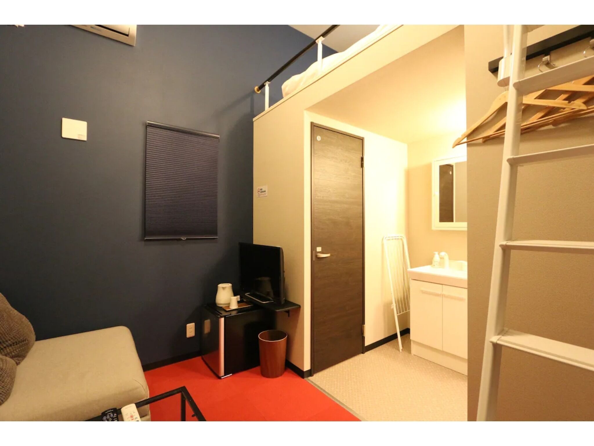 This room offers a double futon in the loft for sleeping. Please be careful when climbing up and down the ladder stairs to the loft. The room includes a toilet and a shower room (※ no bathtub). A refrigerator is also provided. Enjoy the stylish space.