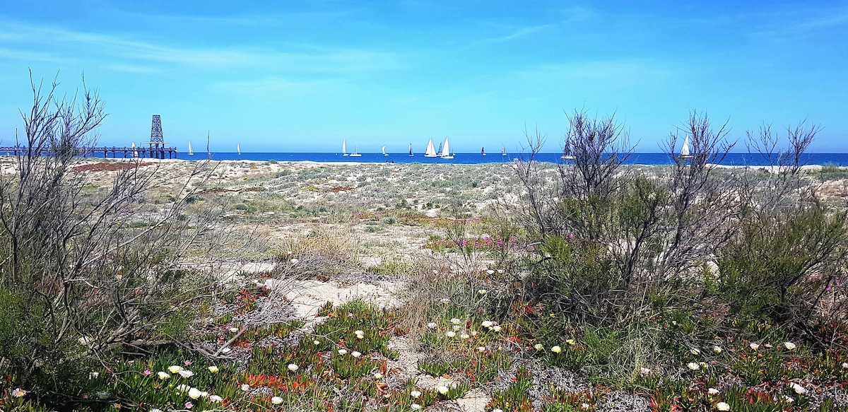 A balcony on the sea extends the place, the view widens. On one side the small port of Narbonne Plage on the other the rocks of the Spanish coast. In between, the huge sandy beach.