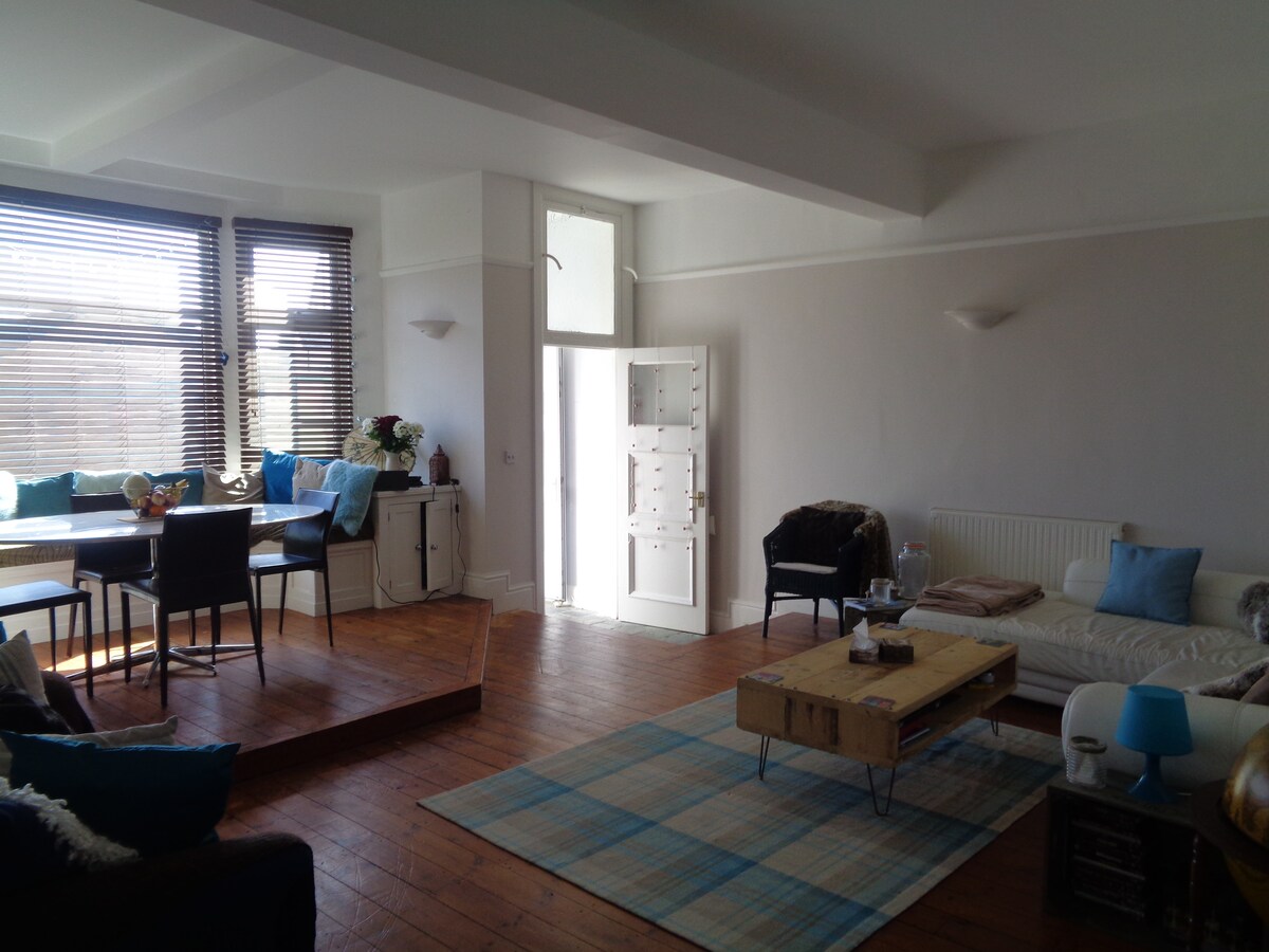 Spacious ground-floor two-bedroom flat with free on-street parking and fast WiFi. Just a one-minute walk to the beach, and cafes, restaurants, pubs and a convenience shop all a stones throw away!