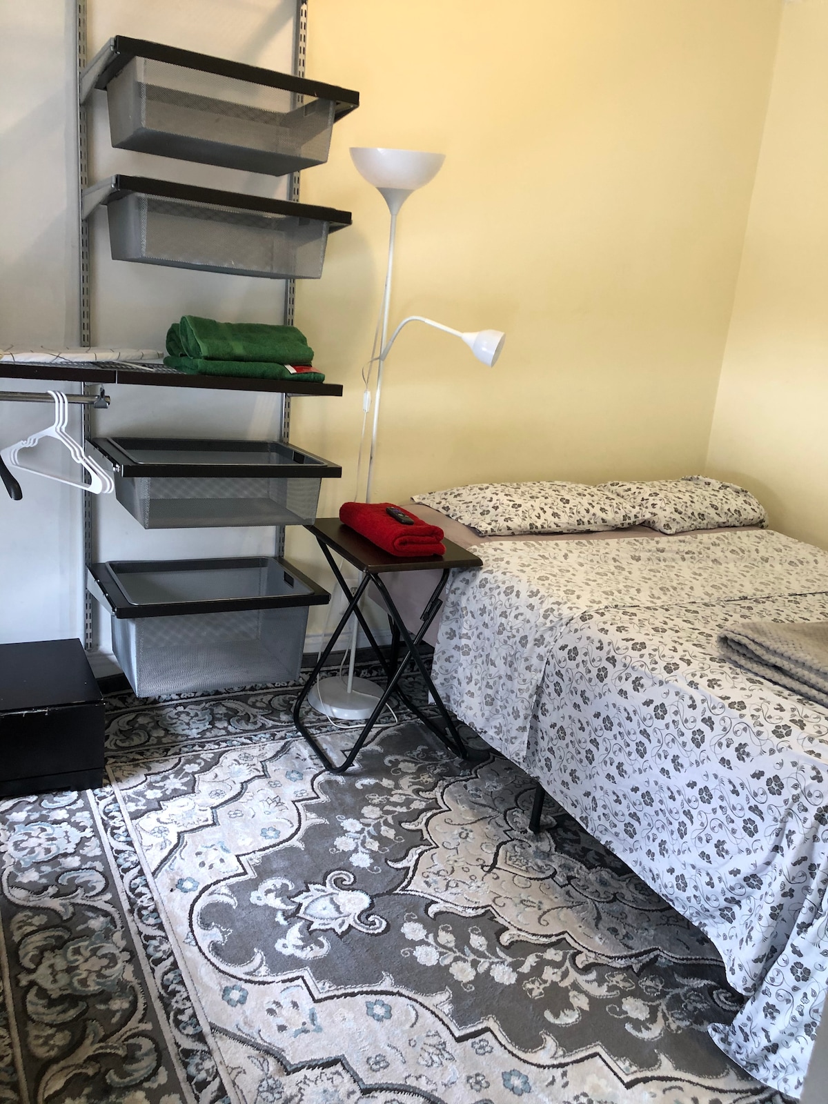 This spacious self contained room has all you need to ensure privacy and productivity. Nearly 200 sq ft, with a workspace and a walk-in closet, ensures you won't be bumping into the walls. Stylish furnishings and lighting, and an extra large 65' SMART TV with access to local channels, NETFLIX, YouTube, and many other familiar apps allows you to feel like home away from home. In-room appliances include mini-fridge, microwave, coffee maker. And semi-private bathroom is right outside your door.