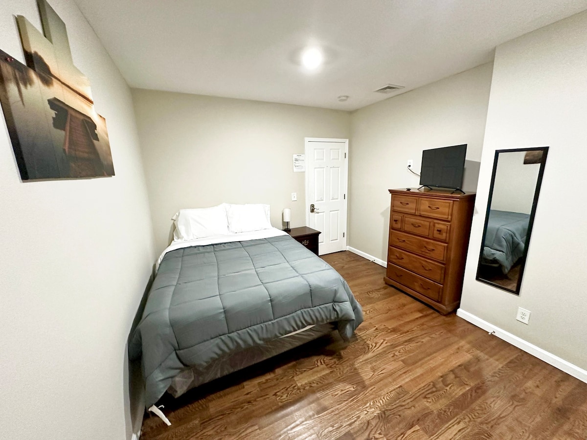 Super clean & modern large studio apartment with private entrance , separate bedroom area (w. 2 Queen beds), private bathroom, living room, and kitchen (w. 4 seat kitchen table, microwave, refrigerator, coffee maker and dishes and silverware). Also flat screen - TV w. Amazon fire stick and Strong Wi-fi (HDMI cord also available).