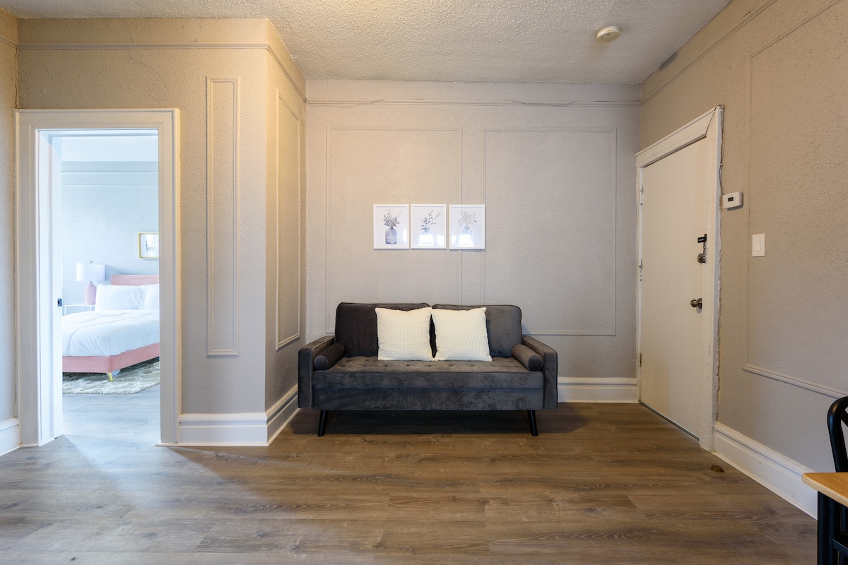This centrally located 1-bedroom is perfect for solo travelers or couples seeking comfort and convenience. Enjoy a spacious, tastefully furnished shared living room, a fully equipped modern kitchen, and a clean shared bathroom. Whether you’re relaxing after a day out or whipping up a meal, you’ll feel right at home here.