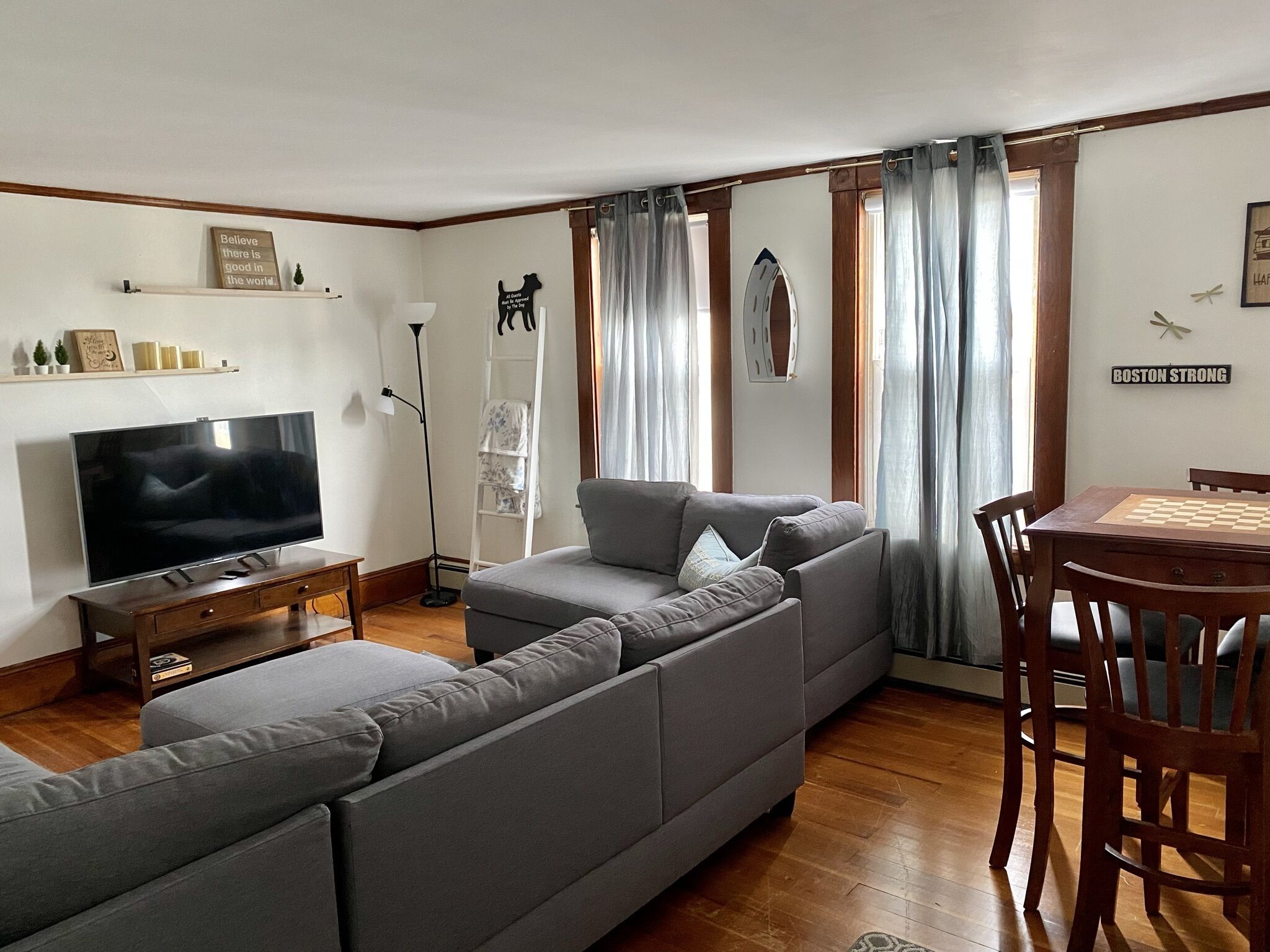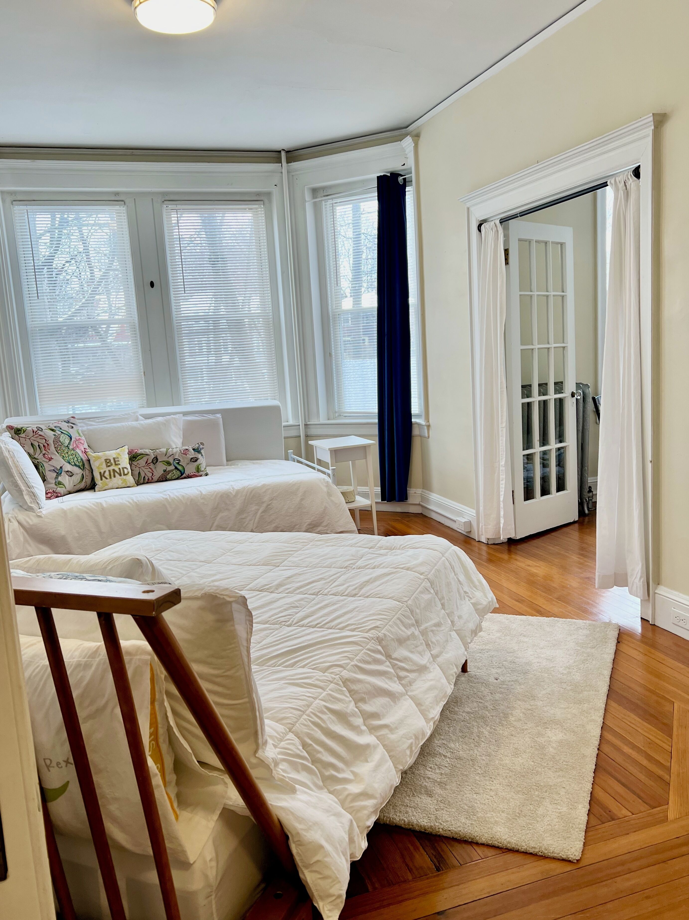 This amazing apartment is conveniently located within a 2-minute walk to the MBTA train station and a tenty minute ride into Boston, making it easy for you to plan your visit. With two bedrooms, one furnished with a king-size bed and the other with a queen-size bed and a daybed, you'll have plenty of space to stretch out and relax. French doors separate the two bedrooms, allowing for added privacy when needed. The main bedroom features sliding doors that can be opened or closed, giving you the option to enjoy the entranceway's spacious feel or keep it cozy. The apartment boasts high ceilings, tons of natural sunlight, and a peaceful ambiance, making it the perfect retreat after a long day of exploring. With a full kitchen, living room, and bathroom, you'll have everything you need to enjoy a comfortable stay. Plus, you'll be steps away from all the shops and restaurants right outside your door! Don't miss out on this fantastic opportunity to experience our one-of-a-kind space.