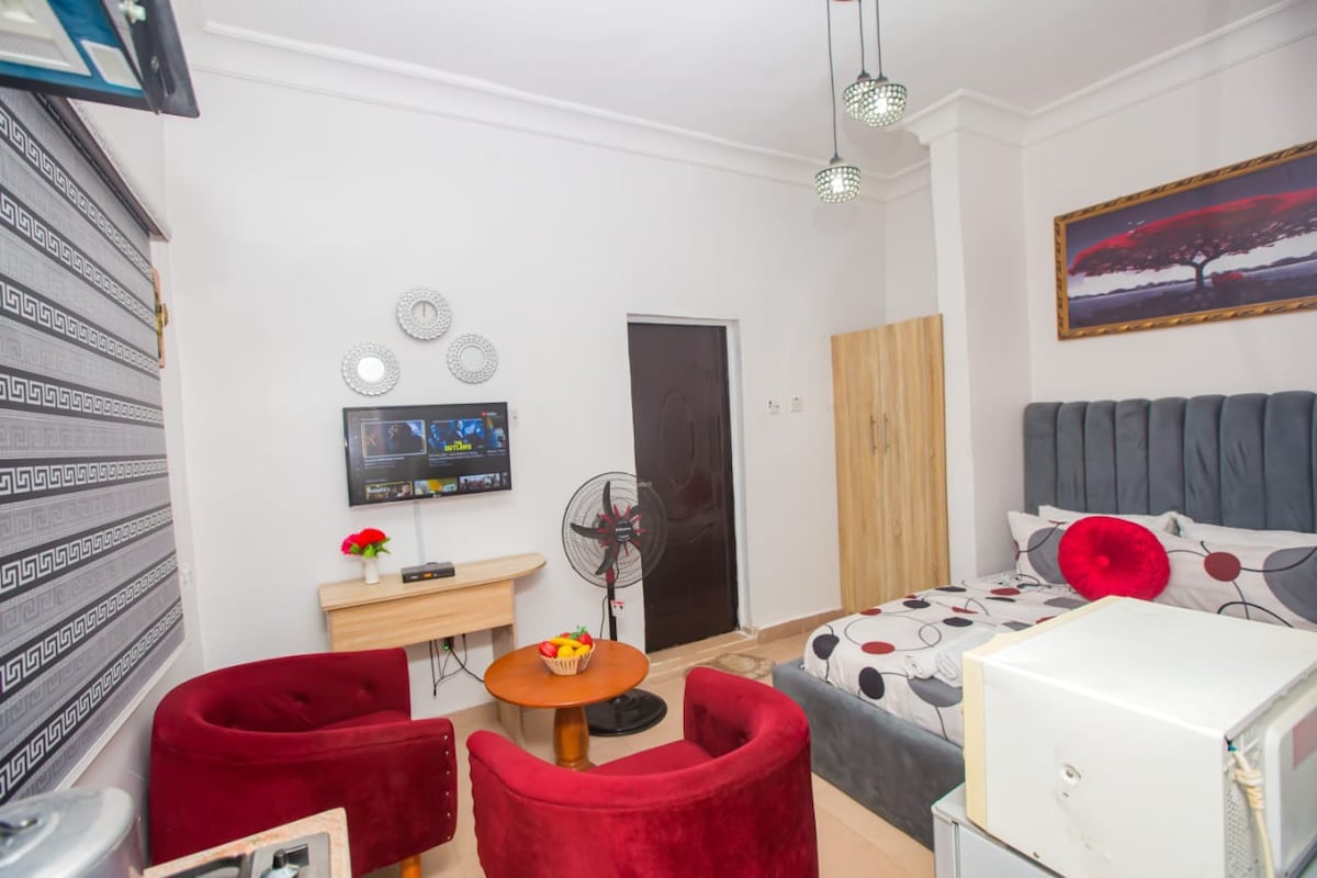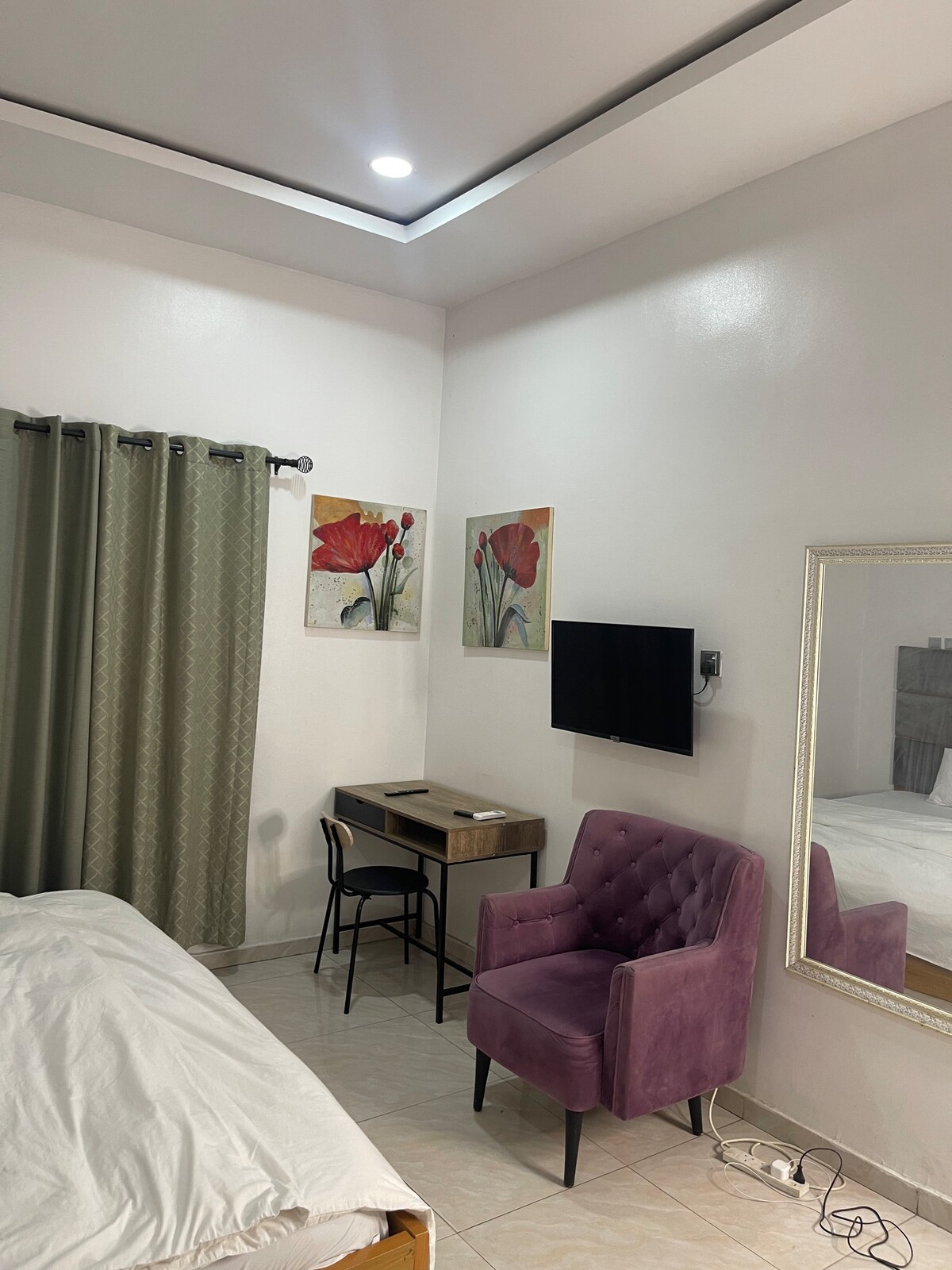 Our generously-sized studio apartment in Isheri, Lagos is fully furnished and designed to provide the utmost comfort and convenience. It offers amenities like a TV, DSTV and air conditioning. With a 2.5KVA inverter and backup 8KVA generator (fuel covered by guest), an uninterrupted power supply. The apartment is located in a secure and gated estate, providing a safe environment. Enjoy privacy and comfort in our apartment whether for business or leisure.