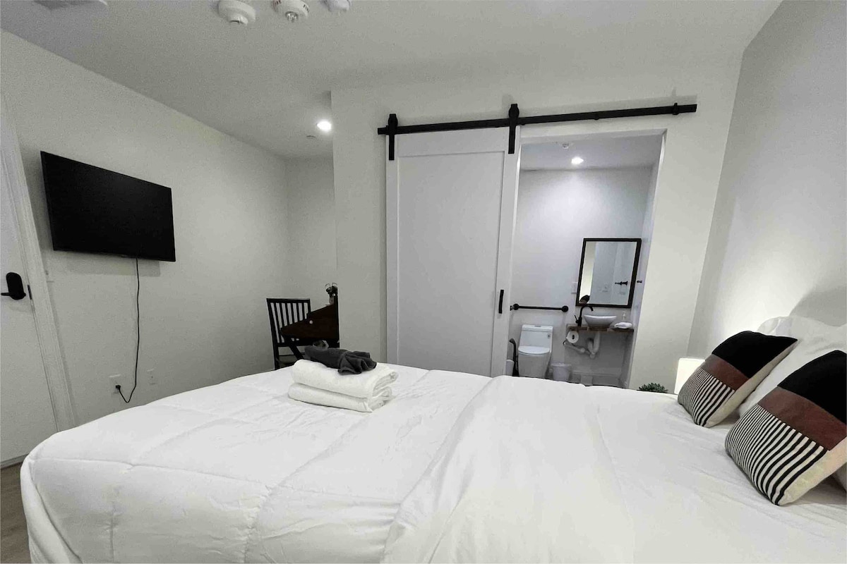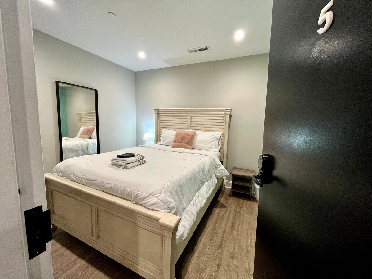 🛏️ Spacious bedroom with a comfortable queen-sized bed and ample storage