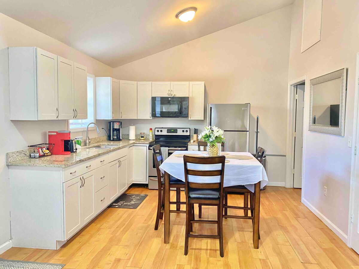 Downstairs offers a convenient half bath, a fully equipped kitchen ready for home-cooked meals, and a cozy living area to unwind.
