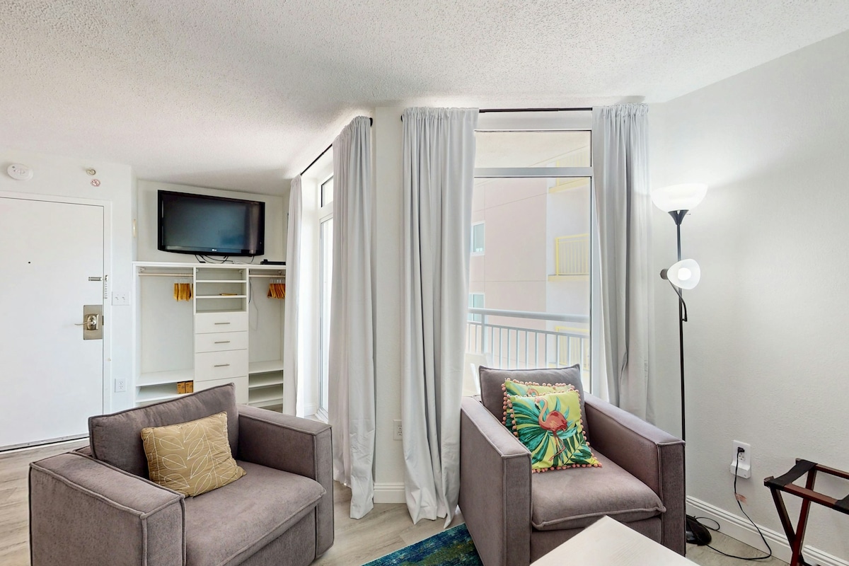 This cozy studio includes a private balcony, an adorable kitchenette with a mini-fridge, and plenty of space to move around in, plus an unbeatable location just steps from beach access! When you're not out building sandcastles, use the free WiFi to download an invigorating playlist to your device then head over to the community fitness center to get in a terrific workout followed by a cool-down swim in the shared pool. The shared hot tub is perfect for soothing those weary surfing muscles, and there's nothing like coming home to stretch out on the suite's king-size bed to take a long afternoon nap after a day of sightseeing. You'll even have central air conditioning to enjoy while you finish that all-important last chapter from the comfort of the living room sofa.