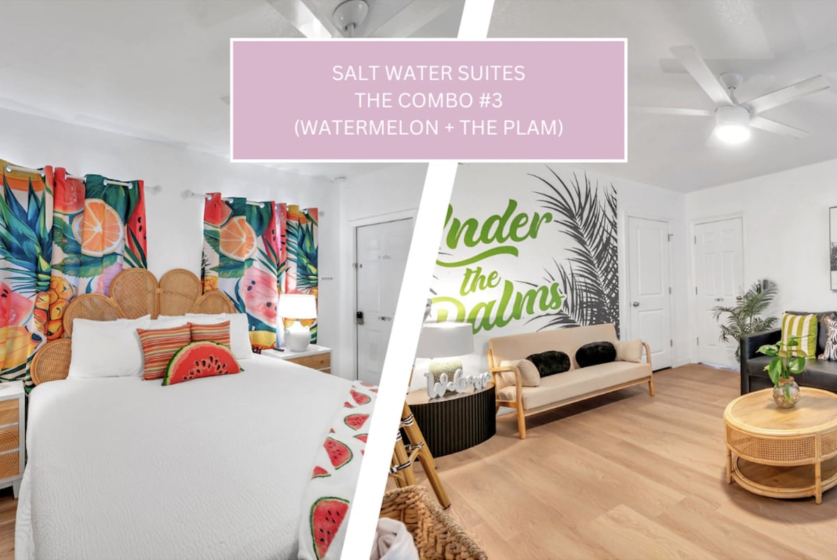 The Florida Suite is the perfect cute and cozy space for you to relax and unwind after a long, full day at the beach! The Florida Suite has a tropical and funky decor flowing through it, with all the perfect touches to make you feel right at home. The suite includes a well-equipped kitchen with Quartz countertops, a full size stove, and full fridge, complemented by retro appliances that lend a nostalgic touch. The suite has a full sized bathroom with private access that has a nice walk in shower, this 2BR offers King and Queen sized beds for you to sink into after your day's full of adventure! Located right next to the pool, this suite is the perfect spot for it all! The suite comes complete with a full linen set, beach and bath towels, essential amenities, and complimentary WiFi.