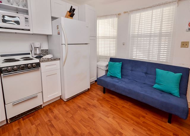 This is a great little unit for a weekend getaway! Sea Rocket #2 is on the ground floor on the south side of the building. The condo sleeps two guests with a queen-size bed and a sleeper sofa. It has an updated compact kitchen and dressing area and is also equipped with free WiFi! You will feel right at home! Please note: There is no guest parking onsite. There is only one assigned spot per unit.