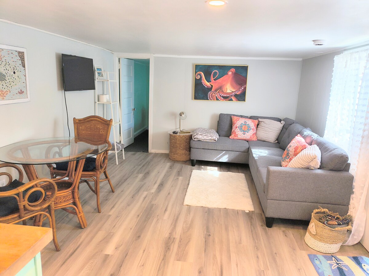The seahorse apartment has a combined living area with a sectional couch and smart TV. Feel free to stream from Netflix, HBO and Amazon prime. There is also a two seat dinette table. You will have a small fridge, microwave, toaster oven, coffee and tea maker and a Keurig for your daily meals. The bathroom has a walk in shower and we provide all your toiletries and towels. The bedroom is cozy with two windows to feel that ocean breeze! Sheets and blankets will be provided and also a white noise maker.