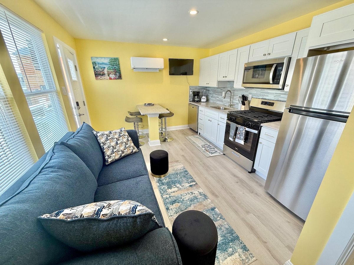 Living room with sofa, full kitchen, one full bath, and one bedroom with a queen size bed. This unit is for couples only.
