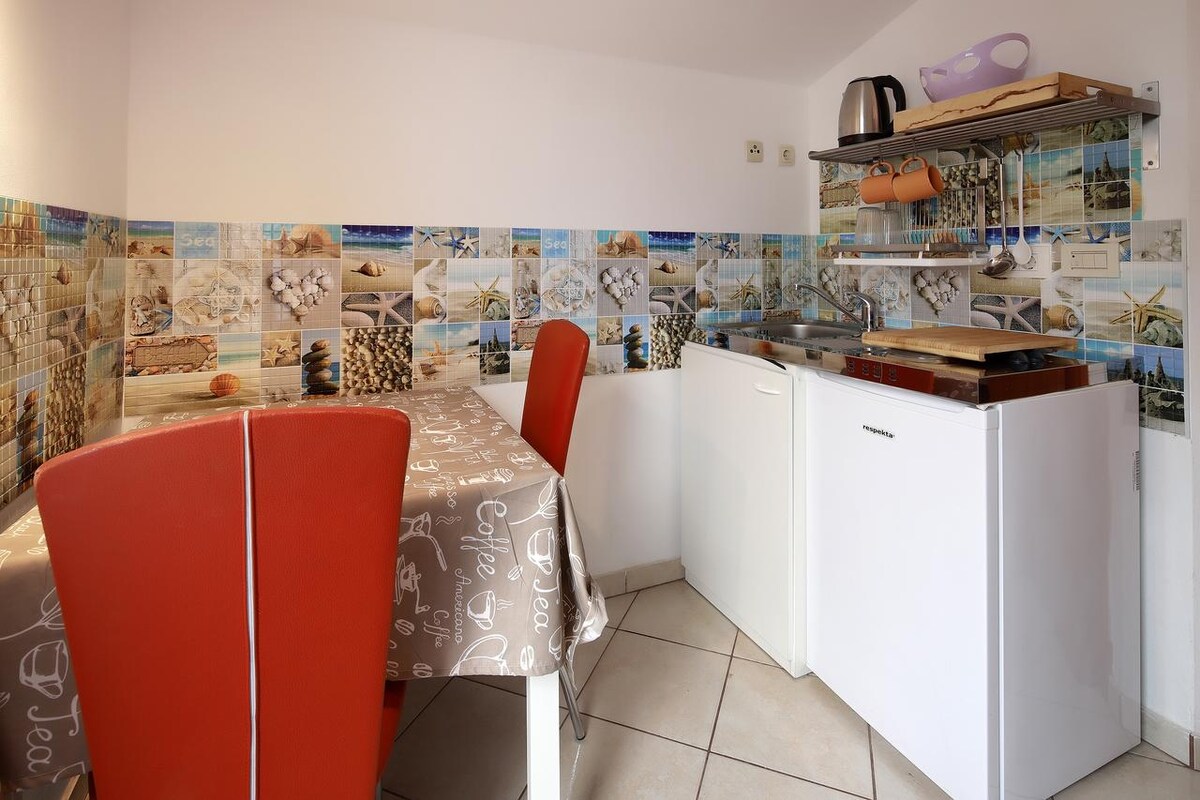 Studio apartment for 2 persons on 2nd floor with a sea/garden view. It offers queen size bed, kitchenette, bathroom with shower and balcony. Free parking space and grill in the garden is also included.