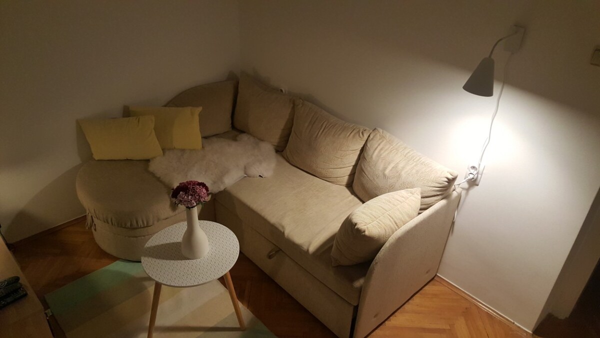 Studio 22 m2 (equipped at the end of 2019) in the center of Novi Sad, 200m from the pedestrian zone. Equipped with a double bed and a pull-out bed. Comfortable for 3 people.