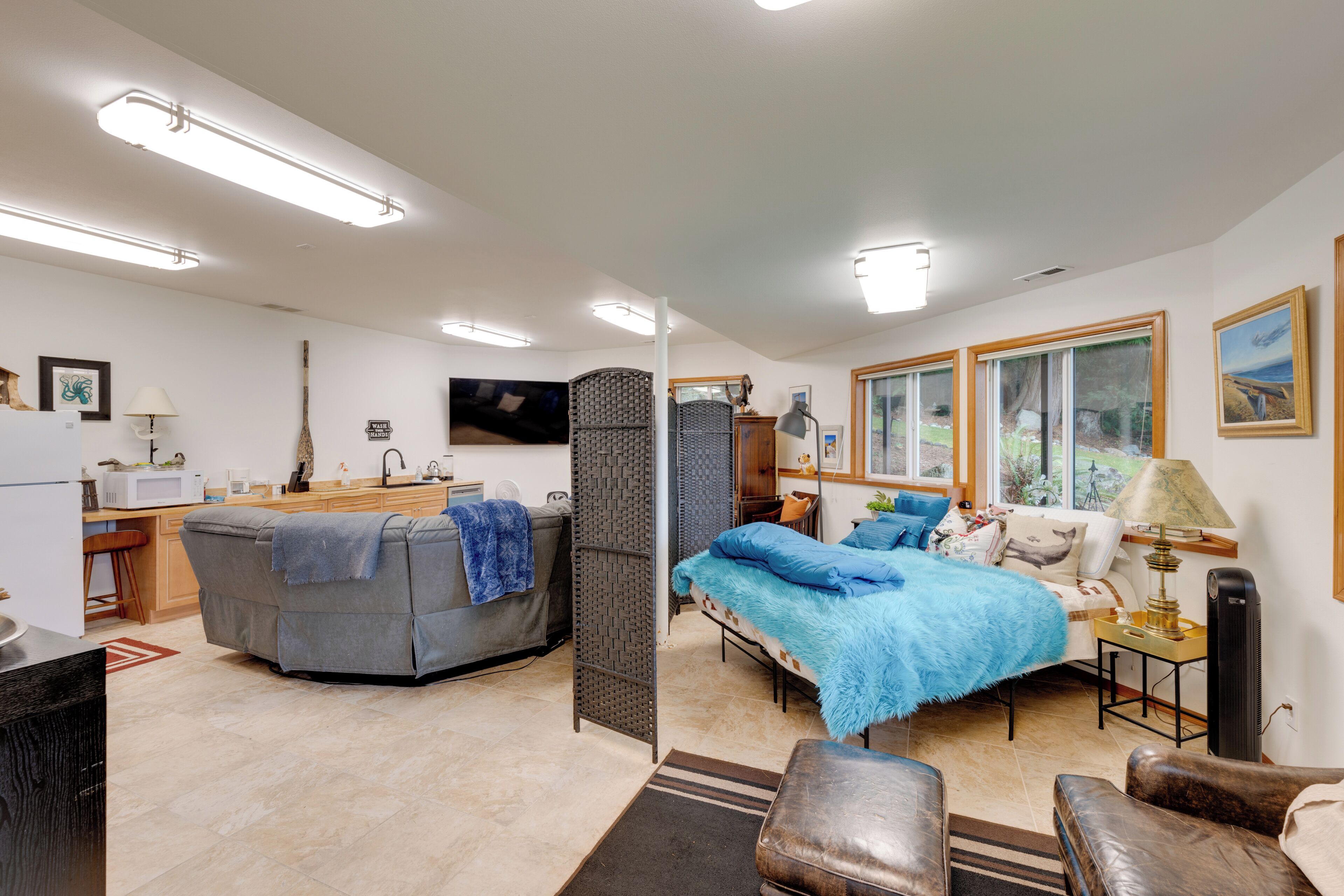 This is the lower level of the lodge which is 3 floors. You have your own separate entrance and area to park. Separate yard and fire pit area accessible right outside your entrance. Views of the bay from the lower level open room and bedroom. Shared bathroom for the bedroom with a queen bed and the open area room that also has a queen bed. Large 70 inch Smart TV and new comfortable large sectional recliners.