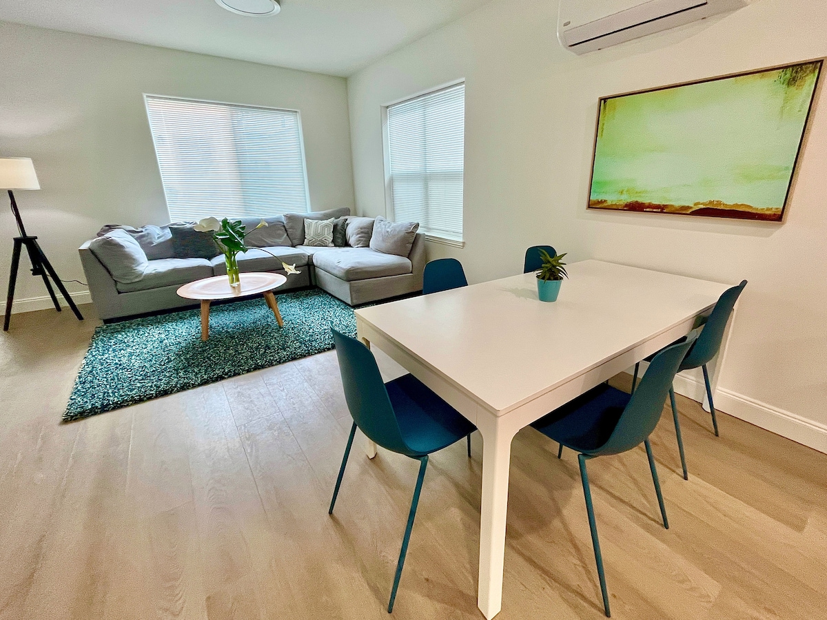 Amenities and surroundings include: Lovely living room area (decorated with art by local artists) with a smart TV and a table for both dining and working. New beautiful bathroom and a contemporary brand new, fully equipped kitchen that has a microwave, a refrigerator, an oven, a stove and a washer/dryer. The entrance to the apartment is separate and private.
