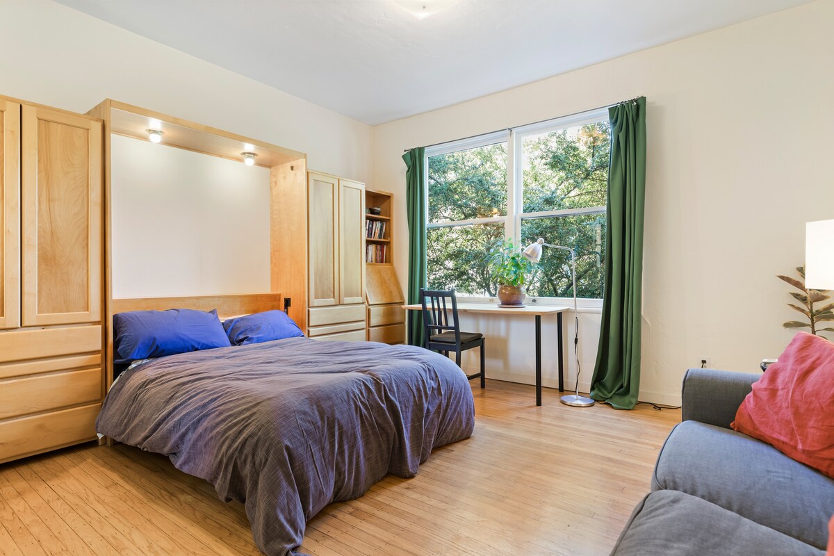 350 square foot studio apartment with Double size bed (54" wide x 75" long) that can fold away into casework. Furnished with what you see in the photographs. There is storage in the casework including clothing hanging rod. The main space has two large west facing windows and a door to the deck. The kitchen has an oven range, refrigerator, microwave, sink, has an east facing window. The bathroom has a toto toilet, tub, sink, linen closet, and an east facing window