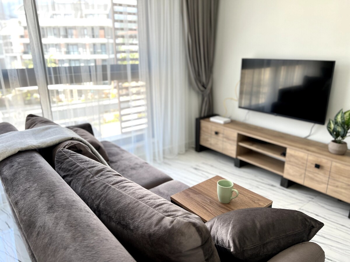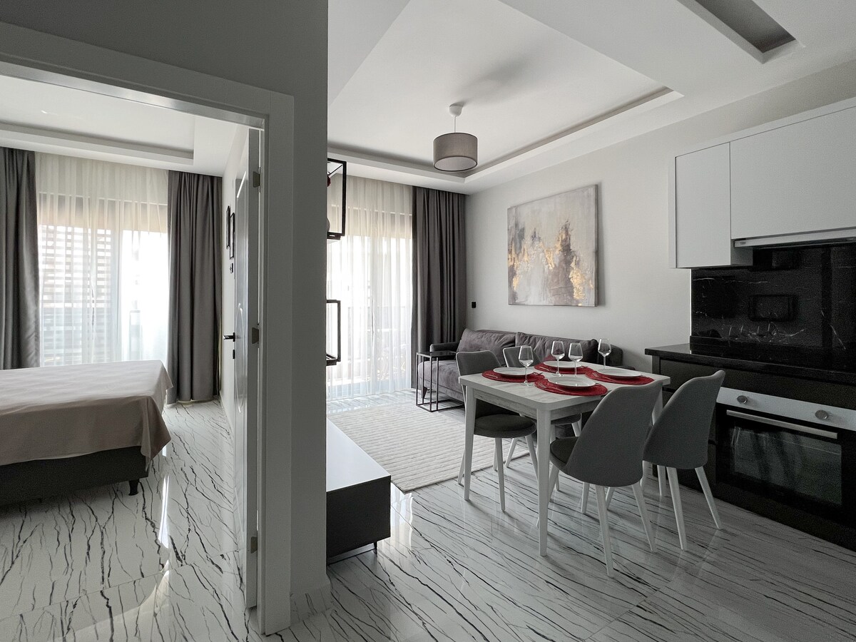 1+! professionally decorated luxury apartment. Newly completed construction includes: indoor/outdoor pool, Haman, massage area, exercise room, security. Apartment features: memory foam mattress, 2 tv's, airconditioning, balocony, American Kitchen. .92 Meters to the Beach, .5 to OBA city center.