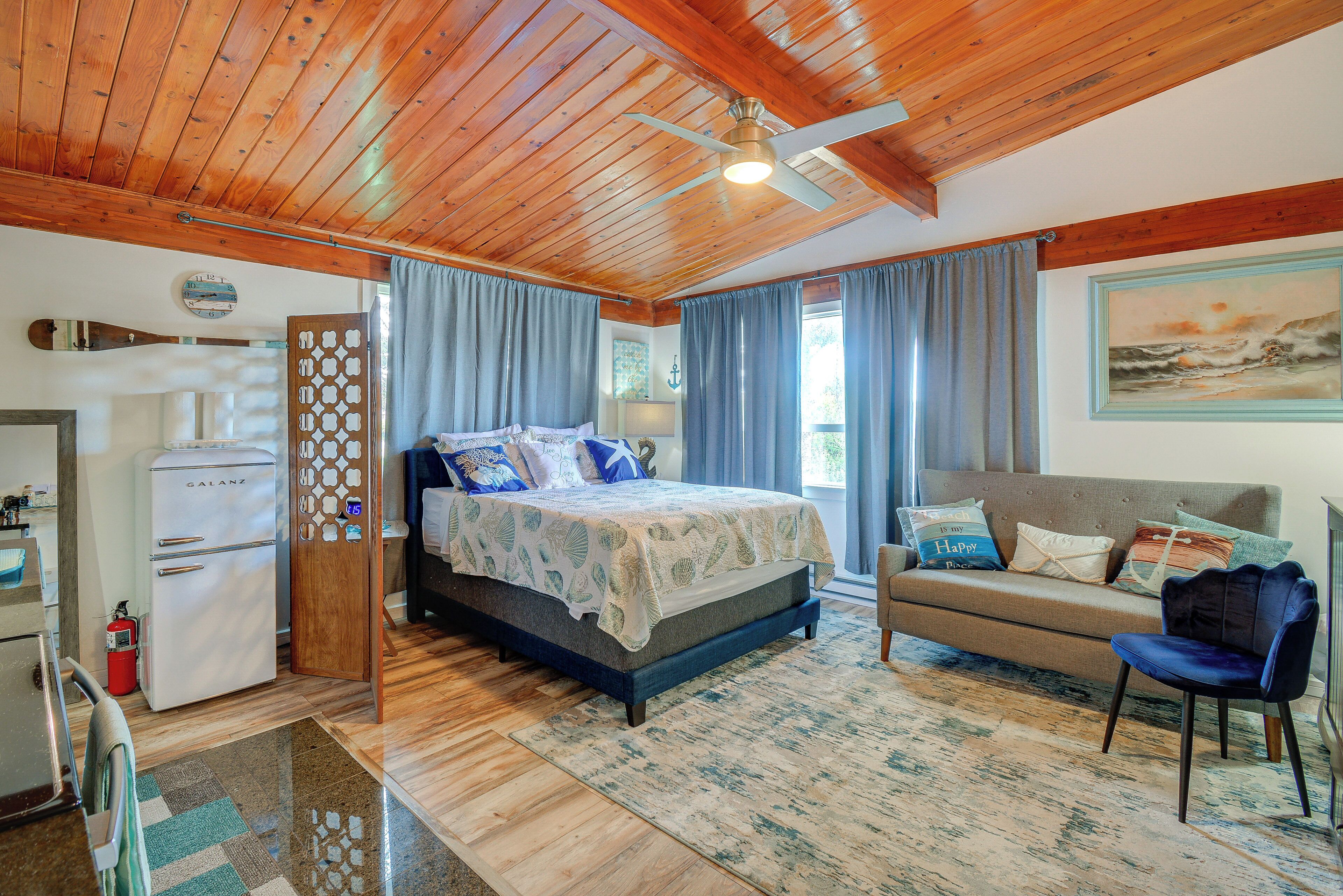 Welcome to our unique & funky getaway, just steps from the beach! Enjoy the soothing sound of the ocean with the windows open. This cozy retreat features a king bed with a memory foam mattress and a queen pullout sofa bed.