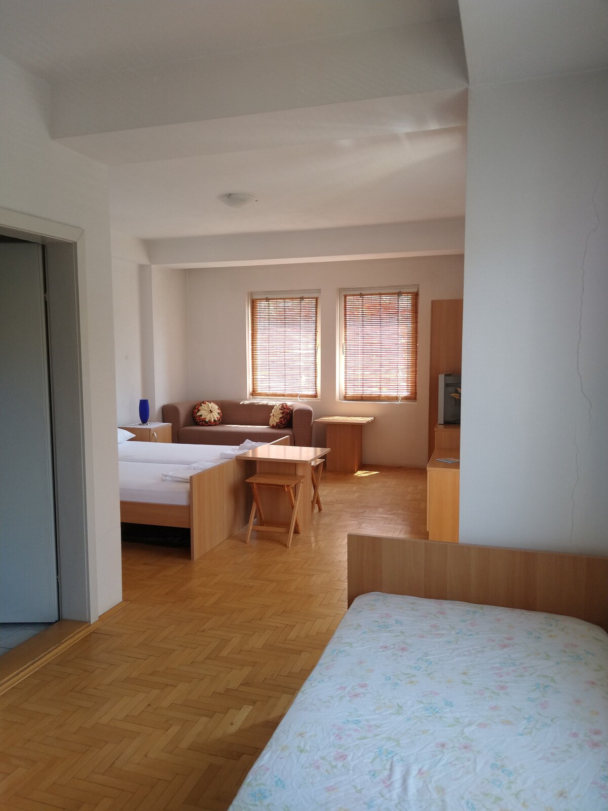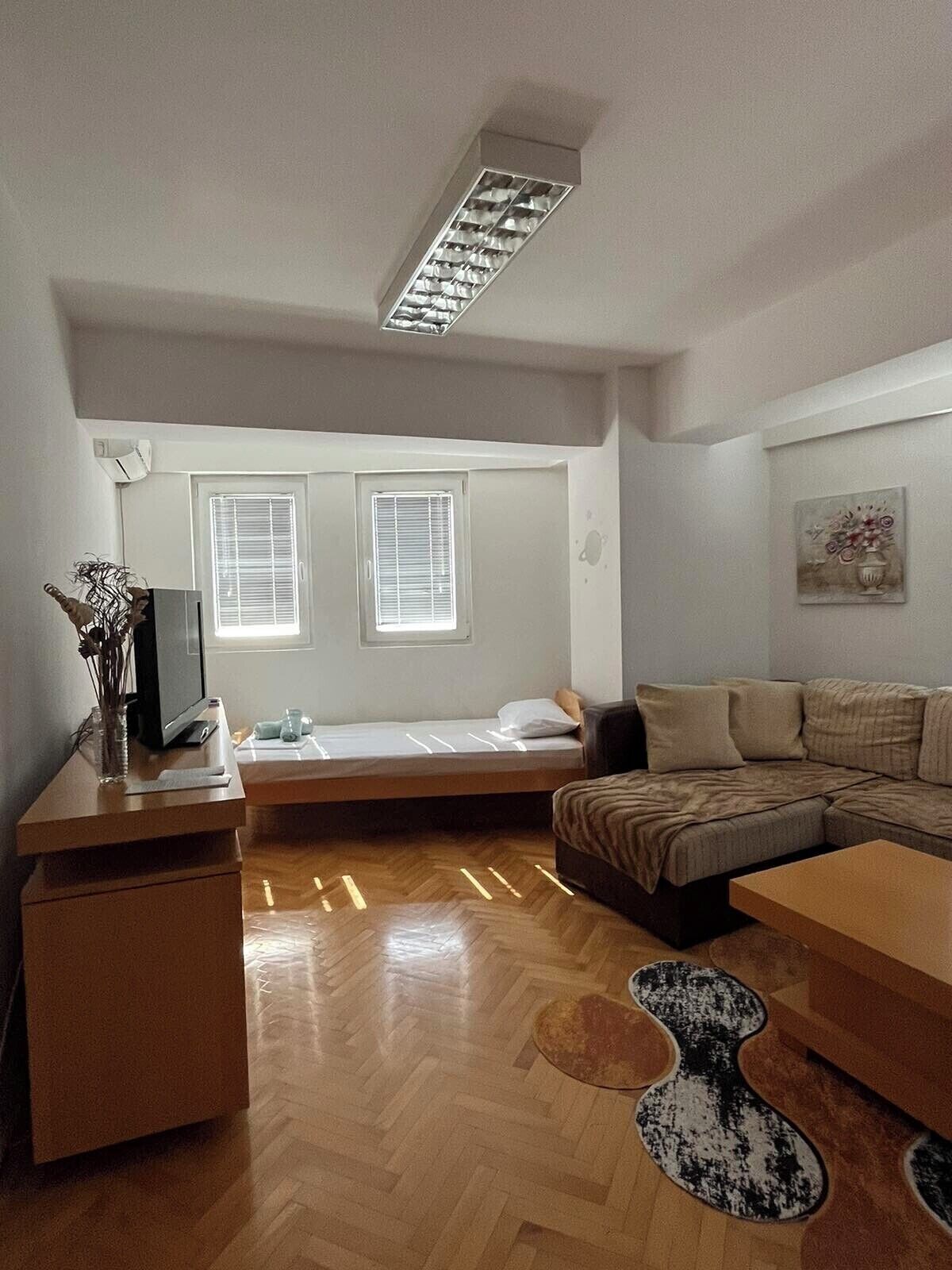 You can expect some street noise in this apartment as it faces the one-way, single lane street Dimitar Vlahov. The apt has nice views to a park, the mountain Galicica and a beautiful spacious balcony with outdoor seating where you can people watch and also have a view of the old town. The apartment and balcony are freshly painted.