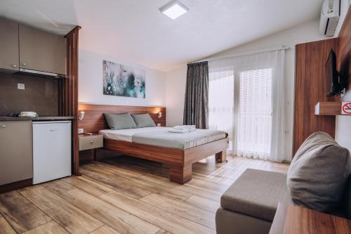 Martina’s Retreat, a chic ground-floor studio in tourist resort Saint Stefan, 4 km from Ohrid town, blends elegance and comfort. Perfect for 2-3 adults or 2 adults with 1-2 kids (crib available), this spacious, open-plan space integrates a bedroom, living area, and kitchenette. Large windows flood the studio with light, highlighting high ceilings, two twin beds with premium linens, a cozy sofa, and a sleek dining/work table.