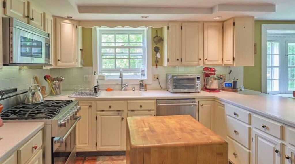 The space is located over a newly constructed garage and it is accessed via a stairwell off the side of the house. As you enter, there is a bench with coat hooks and it opens up to the kitchen/living room. The main eating area is on the expansive island with 4 counter height chairs. There is a pantry with coffee, tea and small appliances. The kitchen area does not have a stove/range, but does come with numerous appliances including microwave, countertop oven/air-fryer, electric griddle, induction hot plate with compatible cookware, waffle iron, blender and more.