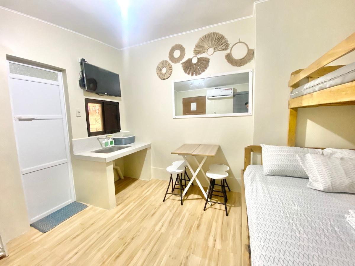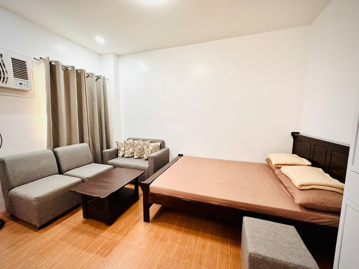 A secured and homey studio type unit is located at the 1st level of the apartment building. The main gate uses an RFID system and CCTV cameras for security purposes. You can enjoy all of its amenities such as air conditioning, dining/living area, cable TV, WiFi, a kitchenette w/ fridge, cooking appliances & a king-size bed. There is also an en-suite with a hot/cold shower for your convenience.