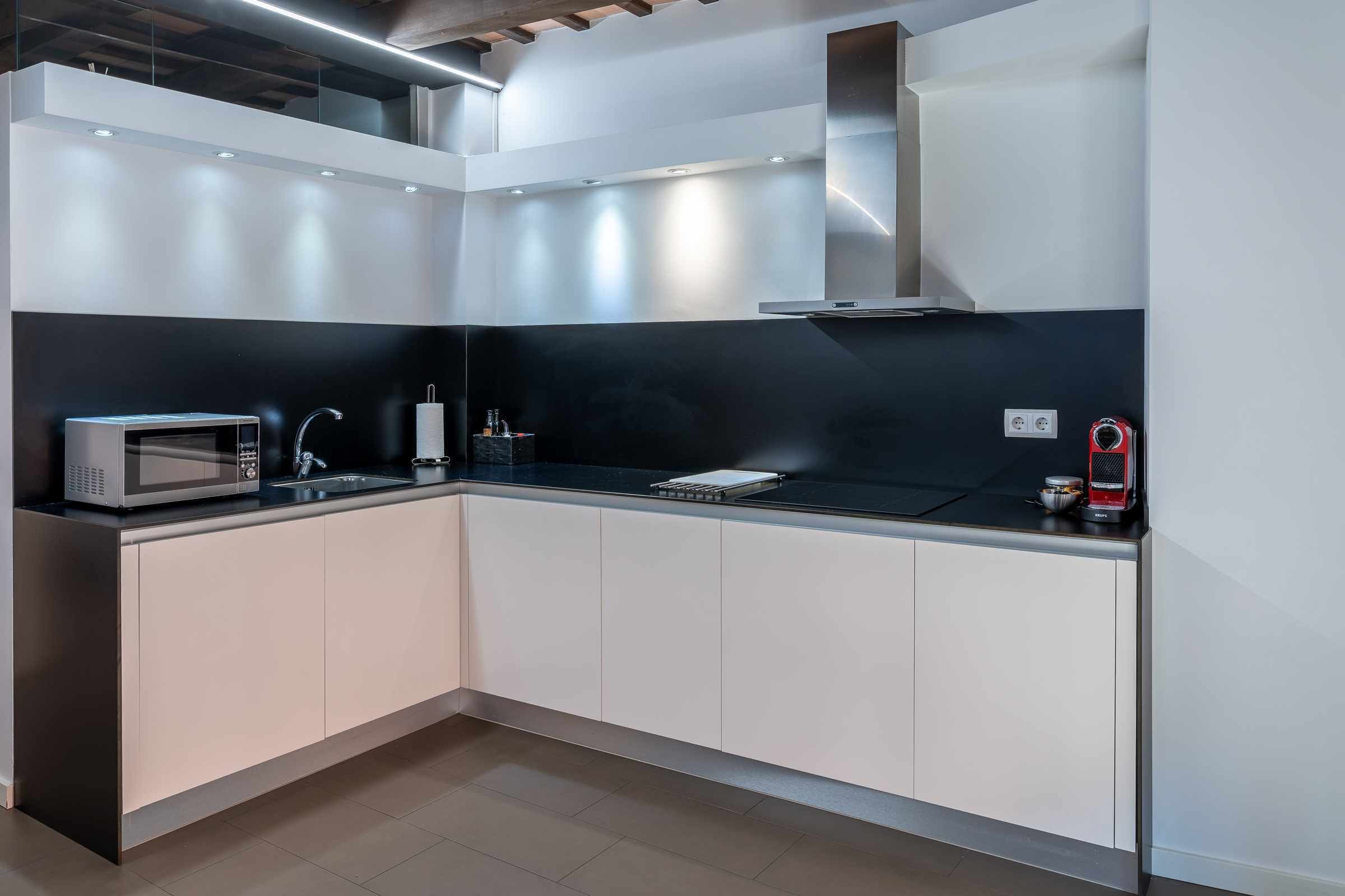 Fully equipped kitchen, with ceramic hob, dishwasher, refrigerator, microwave, coffee maker, toaster and other utensils.