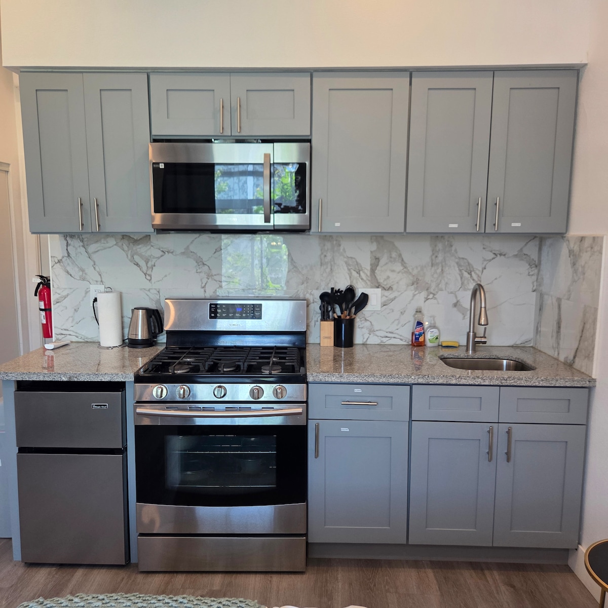 Stove | Oven | Refrigerator | Microwave | Toaster | Water Kettle | Coffee maker | Brita Water Filter | Cooking utensils | Silverware | Oven mitts | Plates and bowls | Mugs, cups, wine glasses | Dining table