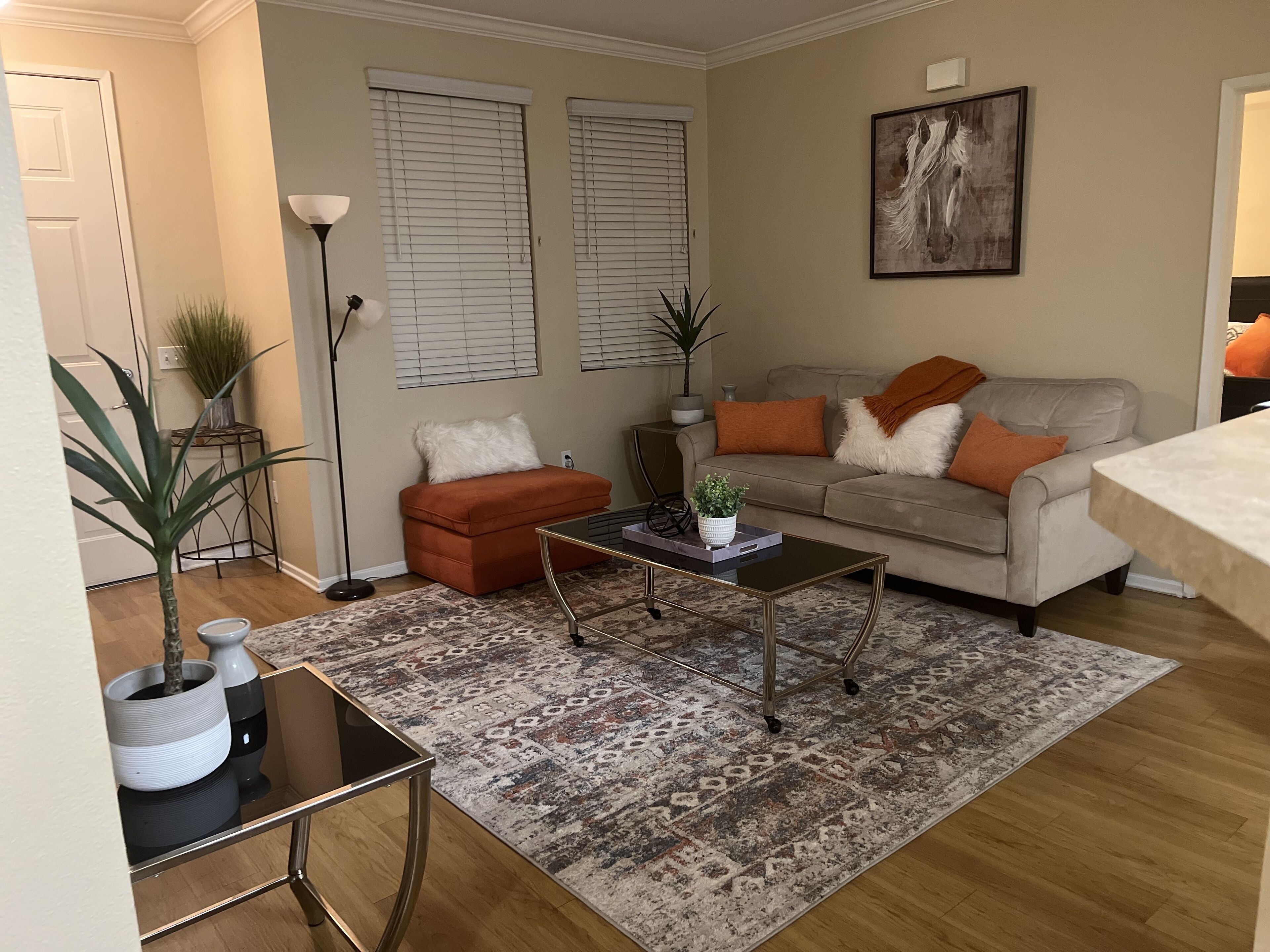 • Living Room: 6-seat sectional, electric fireplace, flat-screen TV, and cozy décor.
