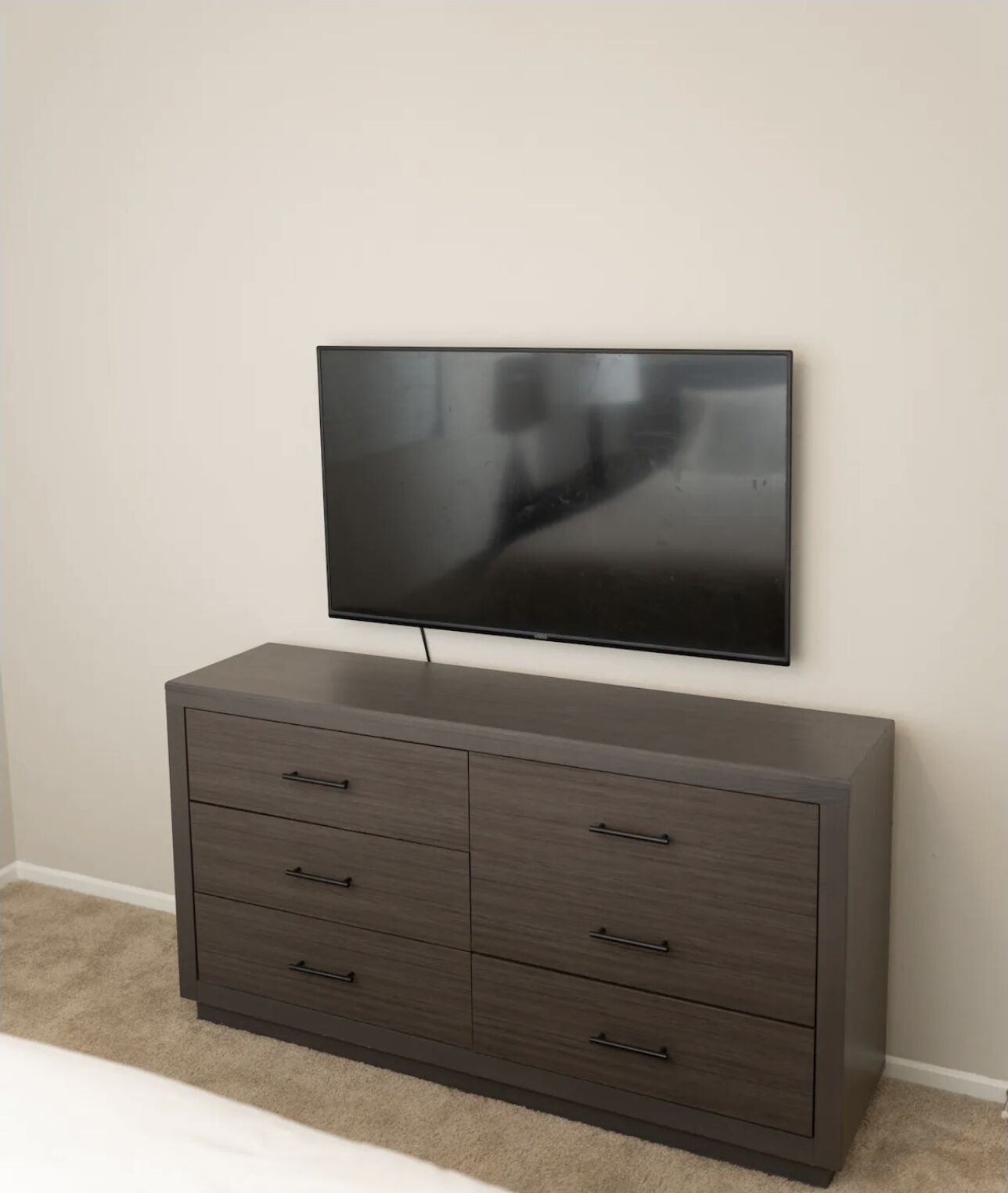 Queen bed | Wall mounted smart TV | Closet | Iron and ironing board | Split AC