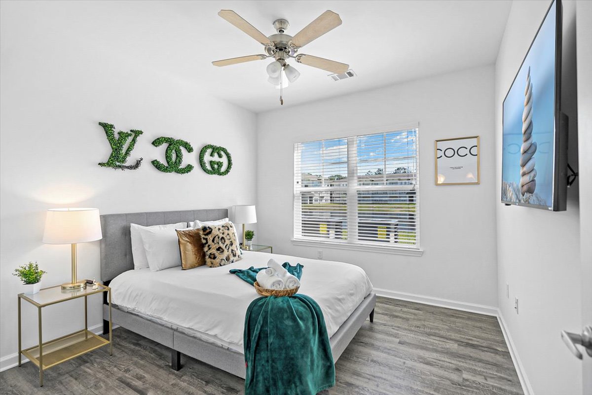 Relax and unwind in comfort! Apartment features all the amenities needed for your stay. Enjoy FREE UNLIMITED WiFi, 65" Smart TV, In Unit laundry and private balcony overlooking the resort style pool.