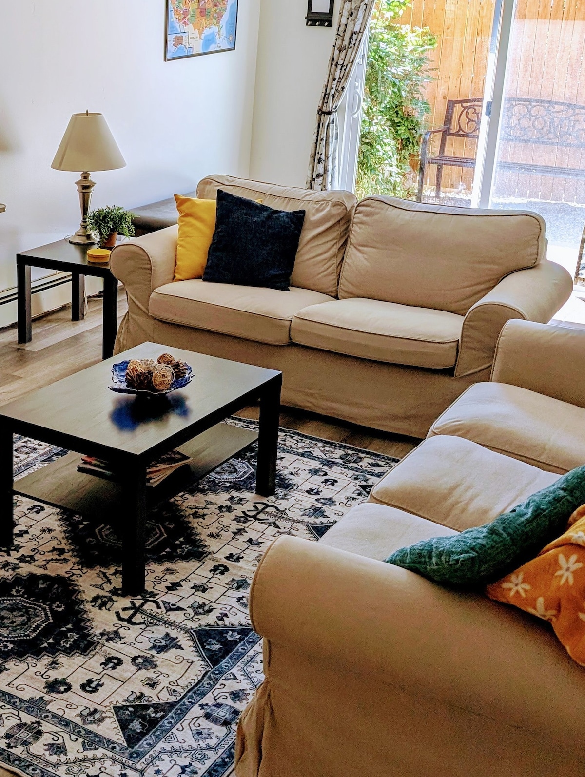 This basement apartment is full of daylight and has a large utility room with kitchenette and laundry. Included appliances are a fridge/freezer, micro-convection oven, coffeemaker, Instapot, toaster and washer/ dryer. Seating for 6 combine at the nook table and the butcher block island bar. An additional folding table for 4 and extra chairs are also available in the under-stairs storage. The utility room has fun connecting puppet theatre windows to a cozy family room with mud room access to a fully-fenced backyard, allowing space for kids to play or an “al fresco” dinner on the patio.
