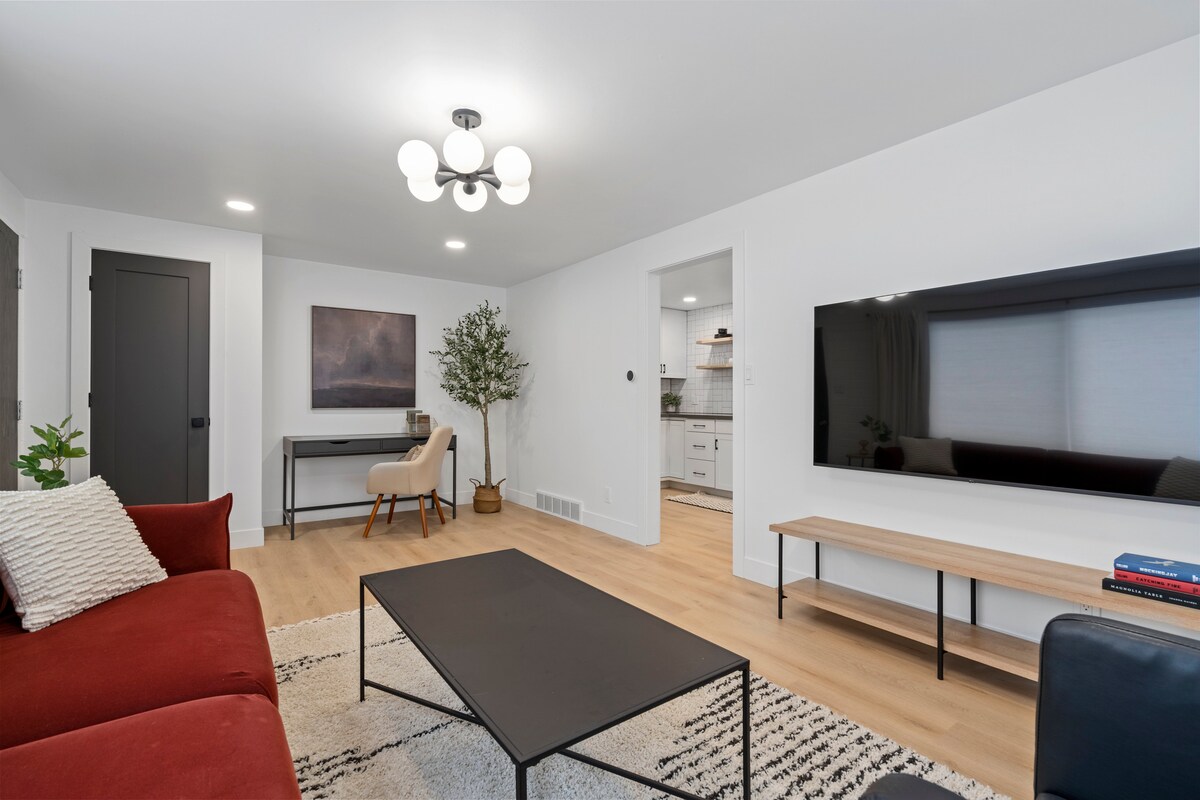 A modern living room with a 60” smart TV, electric fireplace with heater, queen-sizesleeper couch, and one-of-a-kinddesigner LED ceiling lights!