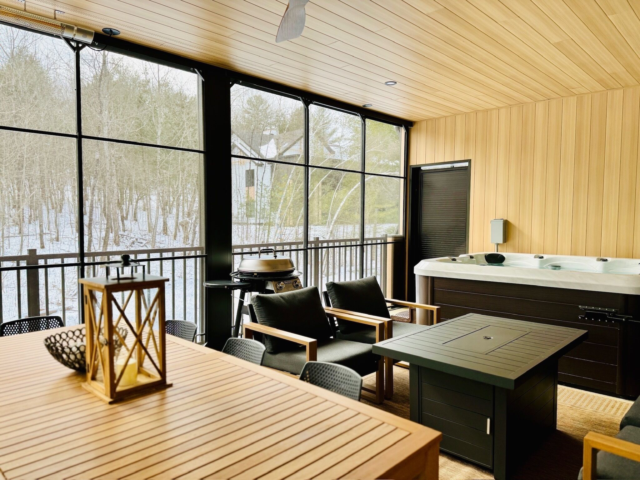 Huge private terrace: Enjoy a 23 x 15 foot terrace without vis-à-vis with a breathtaking view of the woods. It is equipped with a Plancha BBQ, an outdoor lounge and a spa that can accommodate up to 6 people, ideal for outdoor evenings. Note the mosquito net that occupies the entire vertical surface!