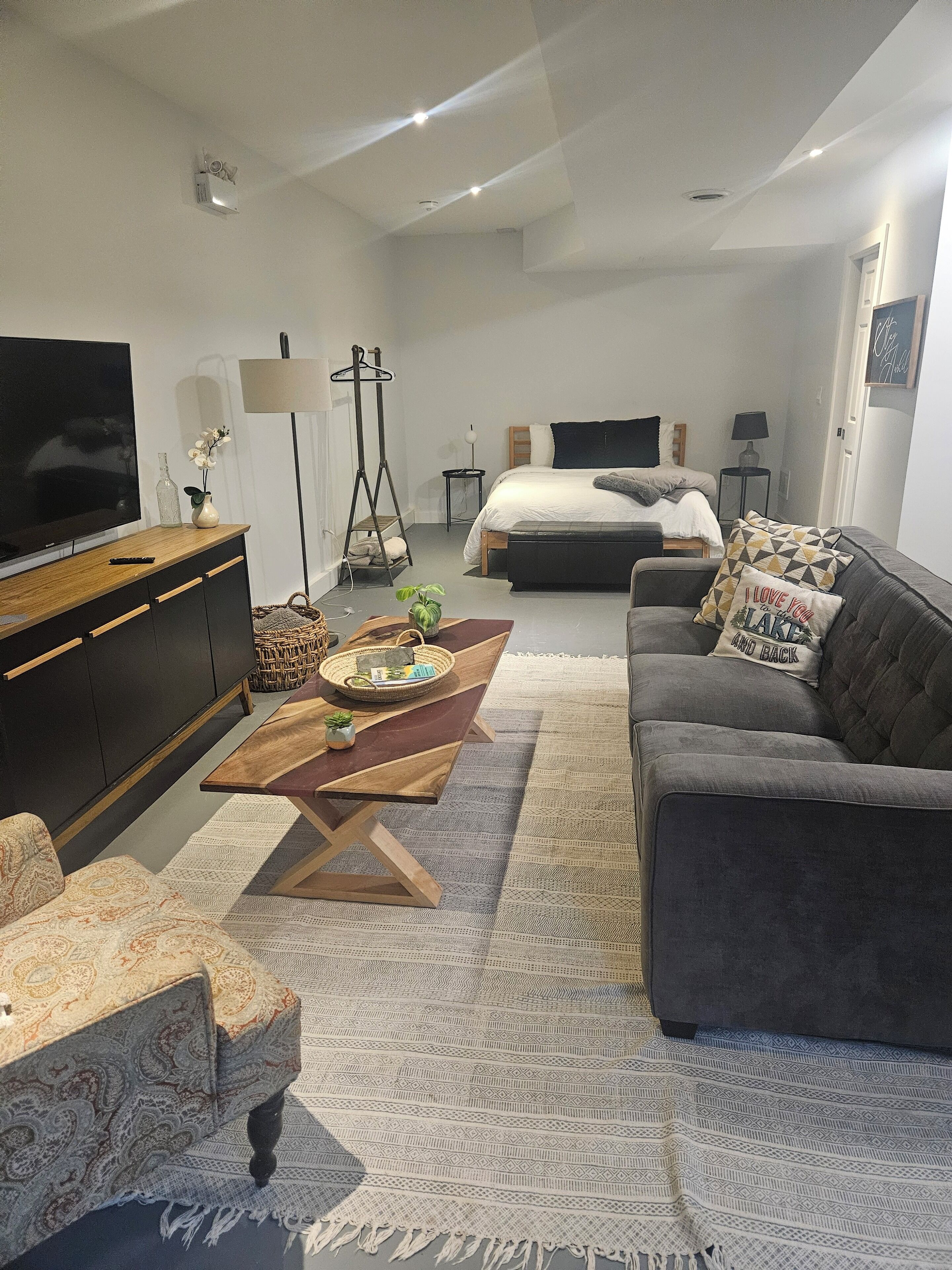 Welcome to our newly finished, spacious one-bedroom suite, nestled in a prime location of Orillia! Ideal for ski enthusiasts, nature, shopping and/or spa lovers. This lower-level gem offers comfort and convenience. Steps from Starbucks, Dining, Fitness & Yoga Studios and just a short drive to ski hills, Vetta Spa, Hiking trails, downtown & Lakehead U. The tastefully designed interior, modern amenities, and easy access to local attractions will make this 900 sq ft Suite a cozy haven you'll want to return to! Please note - there is a shared entrance to your fully self contained Suite. Coffee & Tea provided plus a bar fridge for drinks, ice and snacks :) We look forward to hosting you!